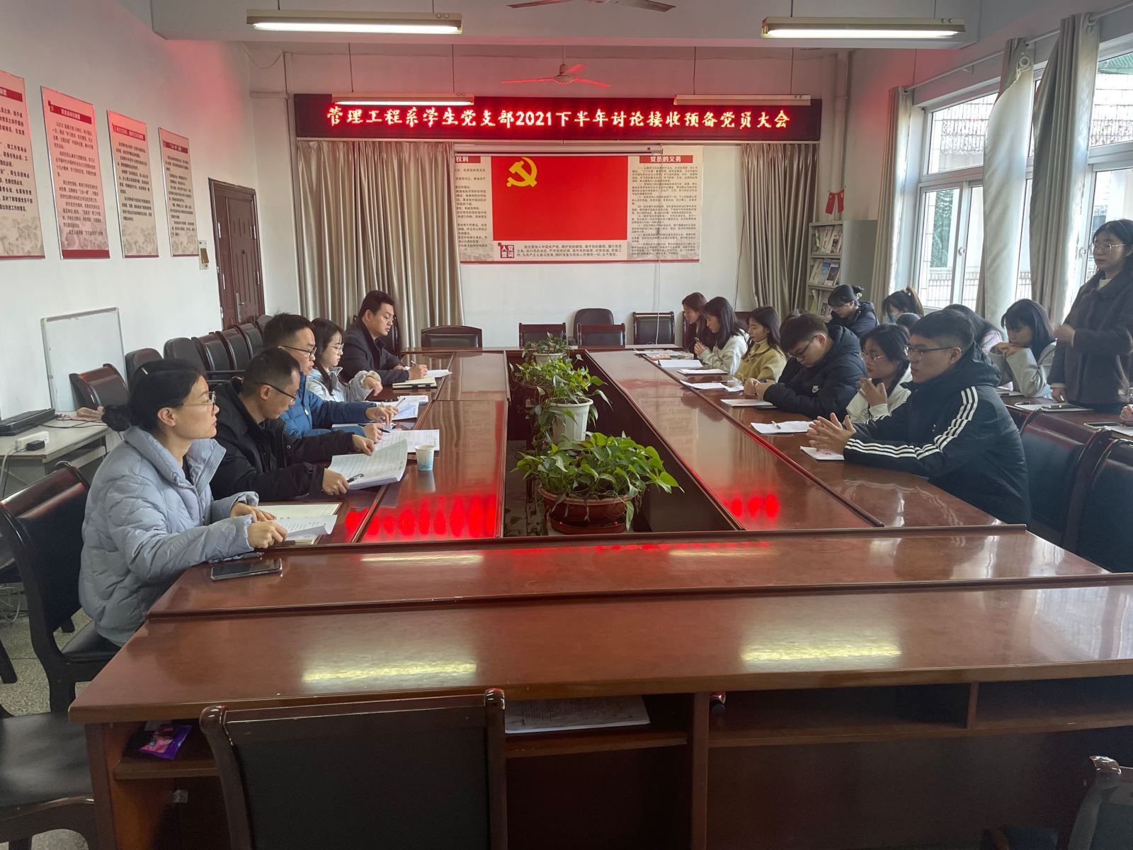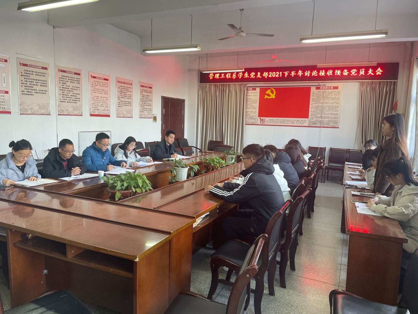 為進一步提升組織凝聚力,擴大黨員隊伍,推進黨員發展工作,11月24日下午,管理系學生黨支部在系會議室召開談論接收預備黨員支部大會。管理系黨總支副書記陶琪、學生黨支部全體教師及和14名發展對象參加會議。