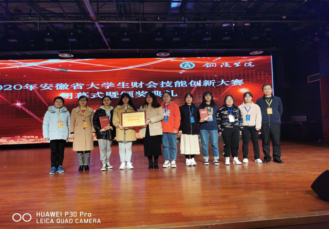 2020年11月29日,安徽省財會技能創新大賽在銅陵舉行。由我院管理系會計專業韓素蘭、鄭天佑和謝婉麗三位老師指導,18會計何婷、周佳美、崔亞娟、吳鴻雯和19會計王冉、張夢瑤、陳高琴、張玉梅八名同學組成的兩個代表隊經過激烈的角逐喜獲二等獎的好成績,同時又以團體第四名的好成績獲得本次比賽的優秀組織獎。