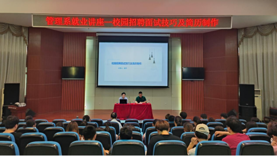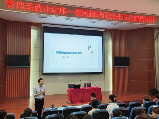 為進一步提升我系學生的簡歷制作水平和招聘面試技巧,幫助同學做好職業生涯規劃設計,5月30日下午,管理系在八角樓舉辦就業專場講座--校園招聘面試技巧及簡歷制作,主講專家為高級人力資源管理師金丹,我系2023、2024屆近百名學生參加了此次講座,管理系黨總支副書記陶琪主持。