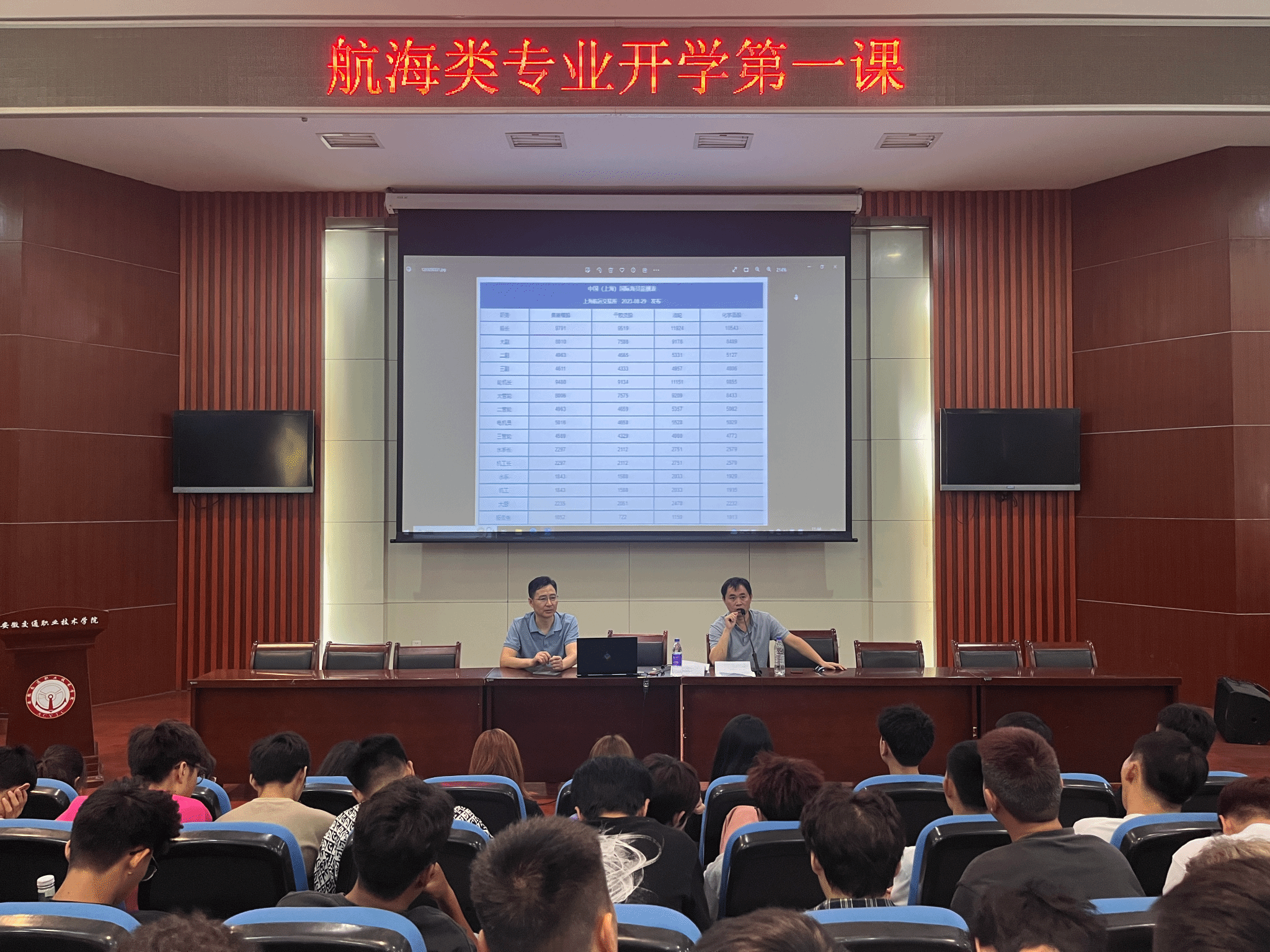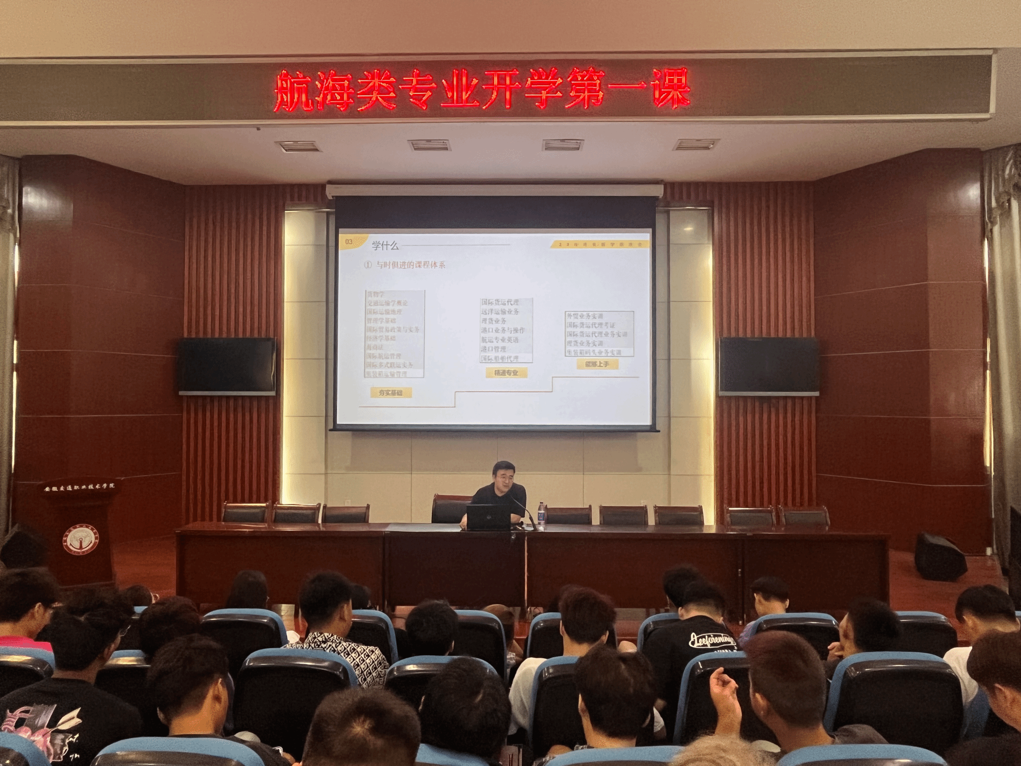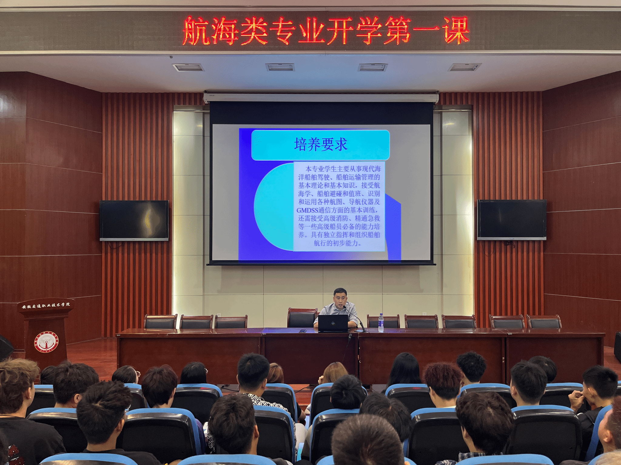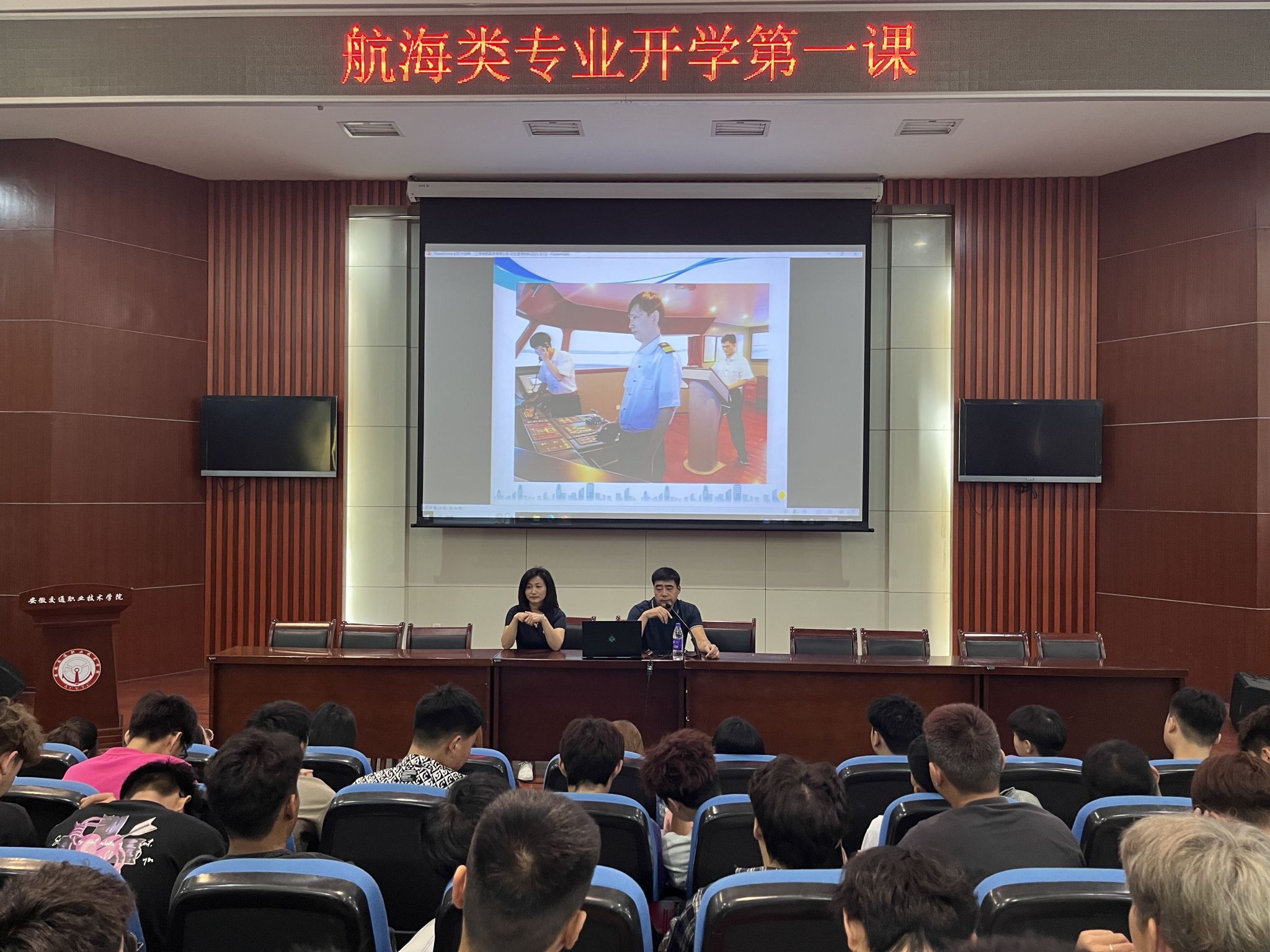 為幫助新同學(xué)了解專業(yè)發(fā)展前景,明確學(xué)習(xí)方向,同時(shí)發(fā)揮企業(yè)行業(yè)專家協(xié)同育人作用,提高人才培養(yǎng)質(zhì)量,9月15日,航海系邀請(qǐng)上海首航船務(wù)有限公司人力資源部部長(zhǎng),遠(yuǎn)洋輪機(jī)長(zhǎng)張保安,以及衛(wèi)獅船舶管理有限公司遠(yuǎn)洋船長(zhǎng)陳鵬,并組織系部骨干教師面向2023級(jí)航海類專業(yè)新生開(kāi)展專業(yè)介紹,會(huì)議由航海技術(shù)教研室負(fù)責(zé)人楊林主持。