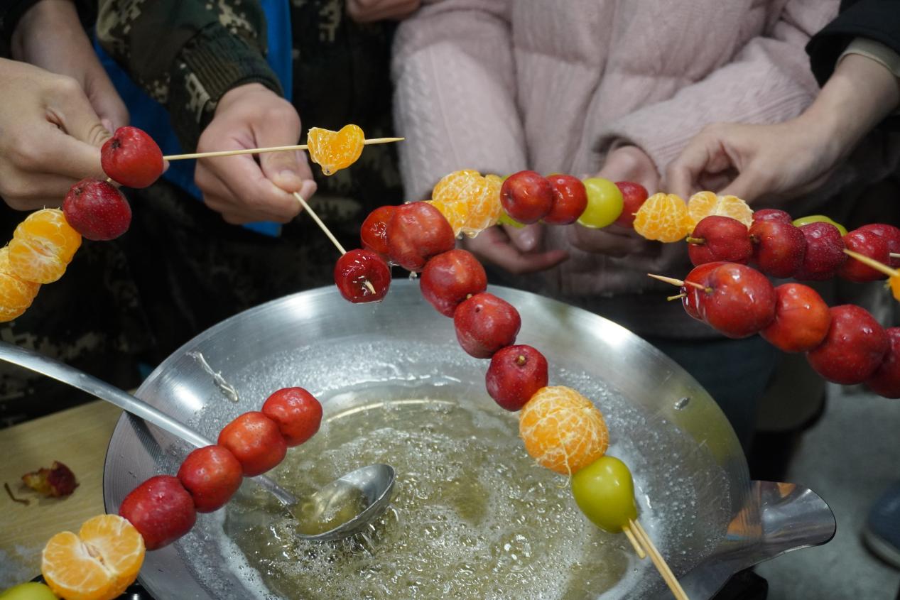 活動現場熱鬧非凡,新鮮山楂、葡萄、橘子等水果散發著誘人的果香,晶瑩剔透的冰糖在鍋中慢慢熬制成金黃色的糖漿,散發出陣陣甜蜜的氣息。