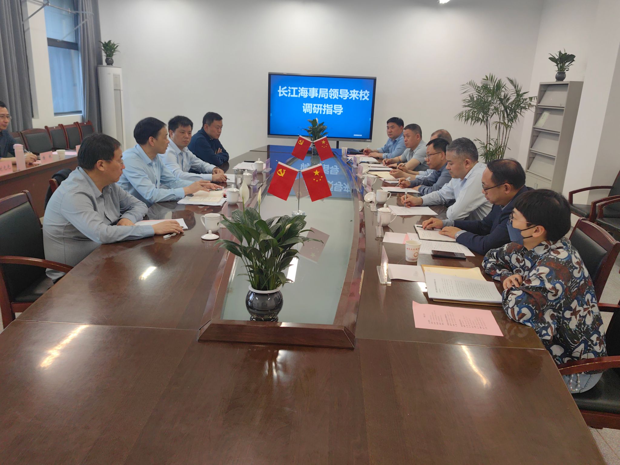 4月11日,長江海事局黨委委員、副局長李世剛等一行蒞臨學院調研指導工作。安徽省地方海事(港航)管理服務中心黨委書記、主任楊紅雷,蕪湖海事局副局長奚家月等陪同調研。院黨委書記楊菲鈴,黨委委員、副院長韋兵熱情接待了調研組一行。雙方圍繞產教融合、新能源船舶船員培養、智能航運技術應用等展開深入交流。