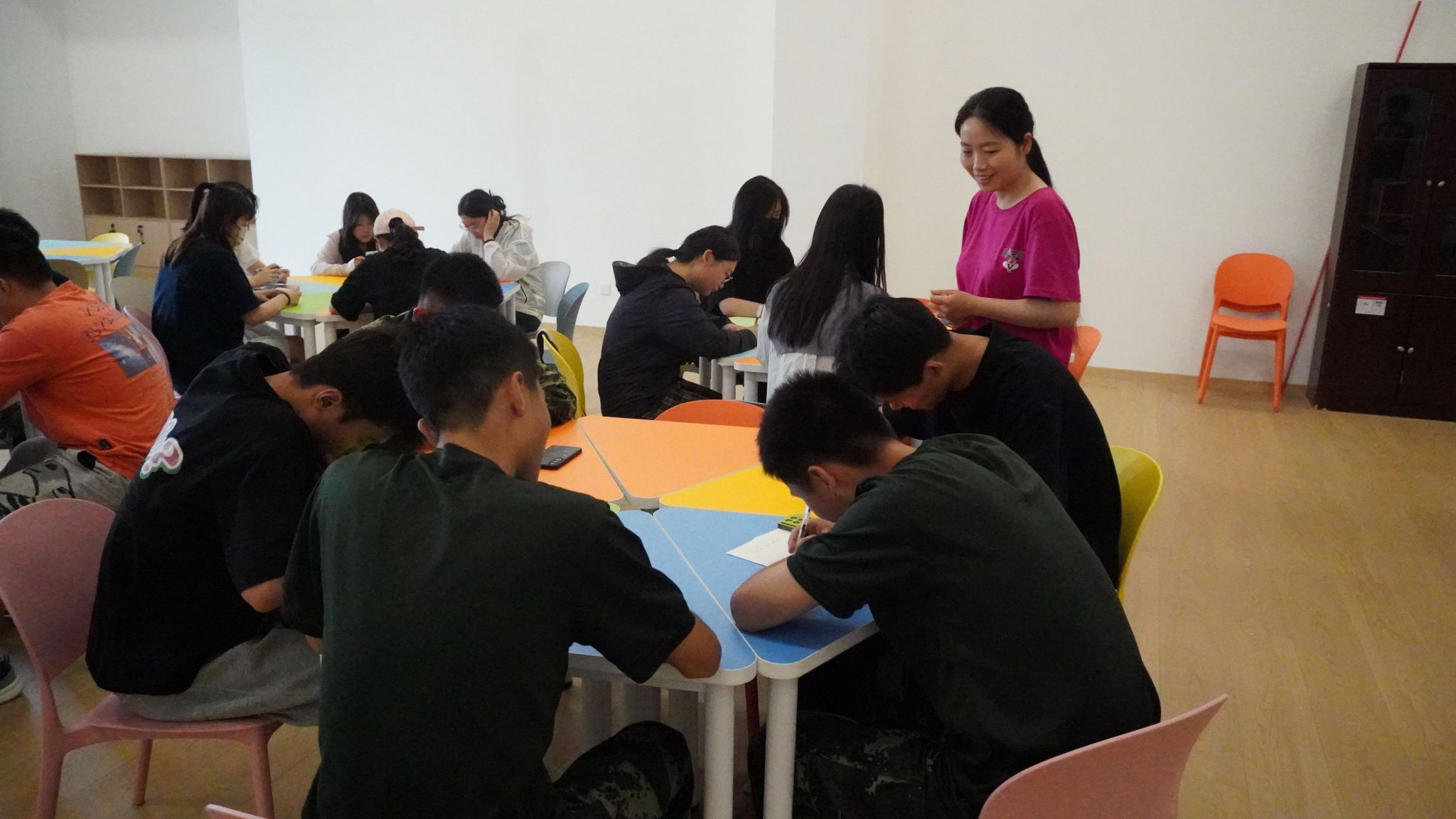 “請(qǐng)深呼吸三次,讓我們暫時(shí)放下評(píng)判,用善意傾聽彼此。”在吳亞會(huì)老師的引導(dǎo)下,同學(xué)們閉眼隨機(jī)抽取“煩惱星”,通過小組討論探索解決方案。第三小組針對(duì)“考試焦慮”提出“分段復(fù)習(xí)法”,第五小組為“睡眠困難”設(shè)計(jì)“調(diào)整睡眠環(huán)境和心態(tài)的方案”。心理吳老師現(xiàn)場示范“情緒日記法”等專業(yè)技巧,幫助同學(xué)們開解心結(jié)。