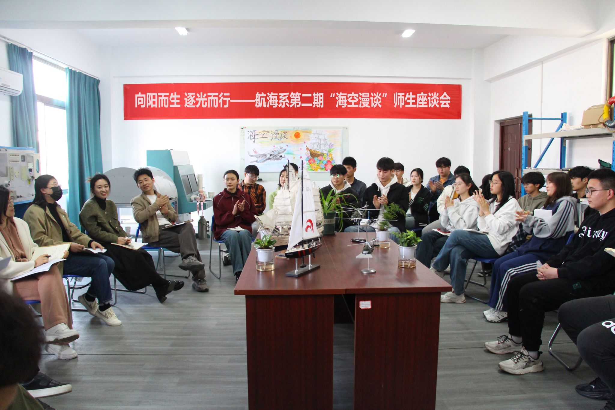 春暖花開,春光明媚,3月15日下午,以“向陽而生 逐光而行”為主題的航海系第二期“海空漫談”師生座談會如約而至。航海系黨總支副書記肖虹和學生管理老師參加座談會,會議由肖虹主持。