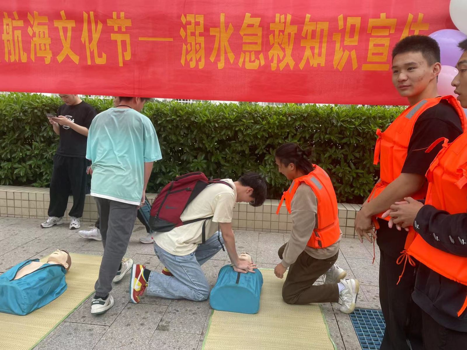 航海系學生用通俗易懂的語言和現場模擬,從溺水的現狀、如何辨別溺水、如何預防溺水、溺水時如何自救、如何施救他人等方面向圍觀同學們進行了詳細講解。現場,學生們利用人體模型講解了人工呼吸和心肺復蘇的操作步驟以及注意事項。演示結束后,圍觀同學們紛紛主動進行實操實練。活動講解深入淺出,幫助廣大學生掌握了溺水后現場急救的技巧和方法,提高了防溺水自覺性和識別險情、遇險自救的能力。
