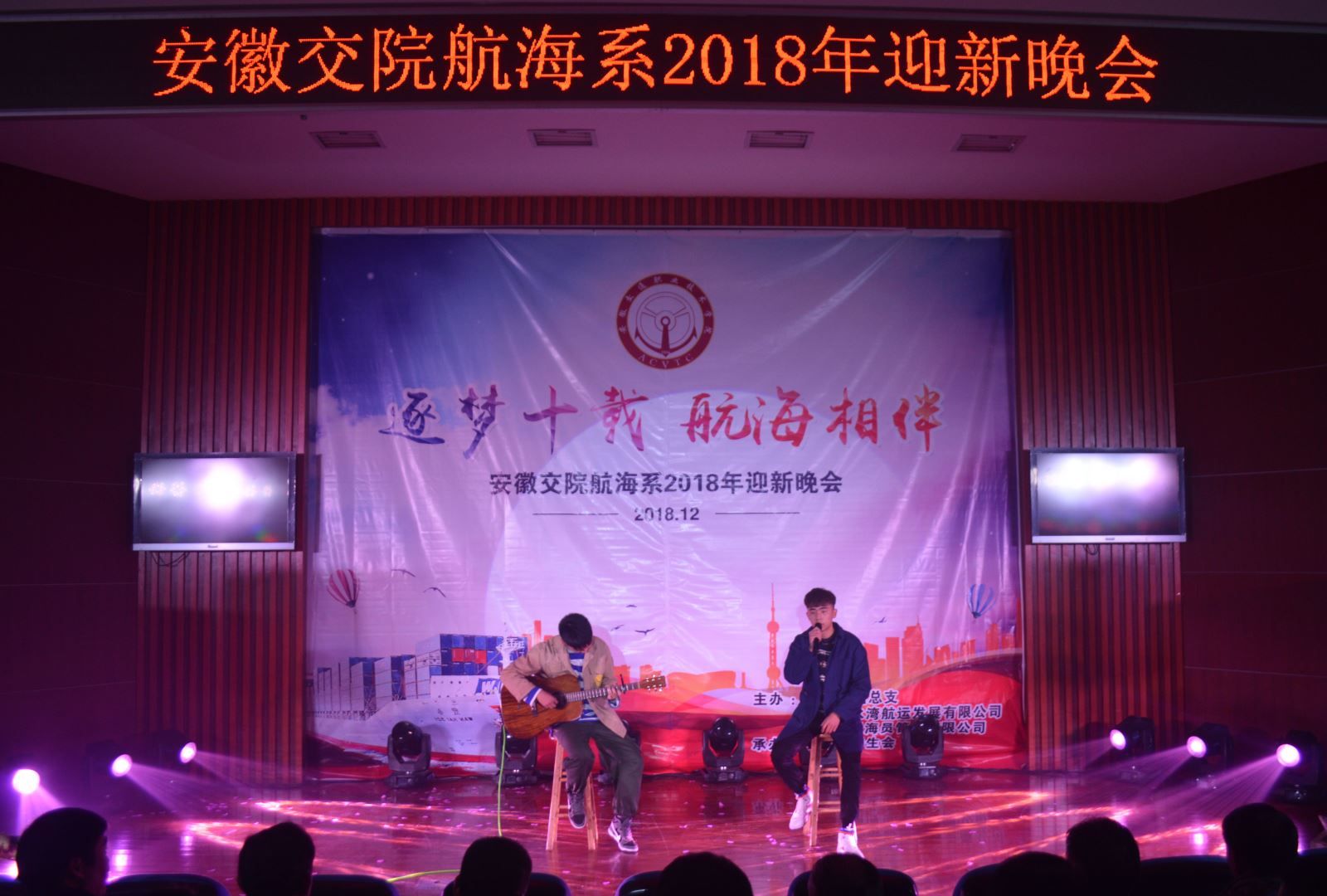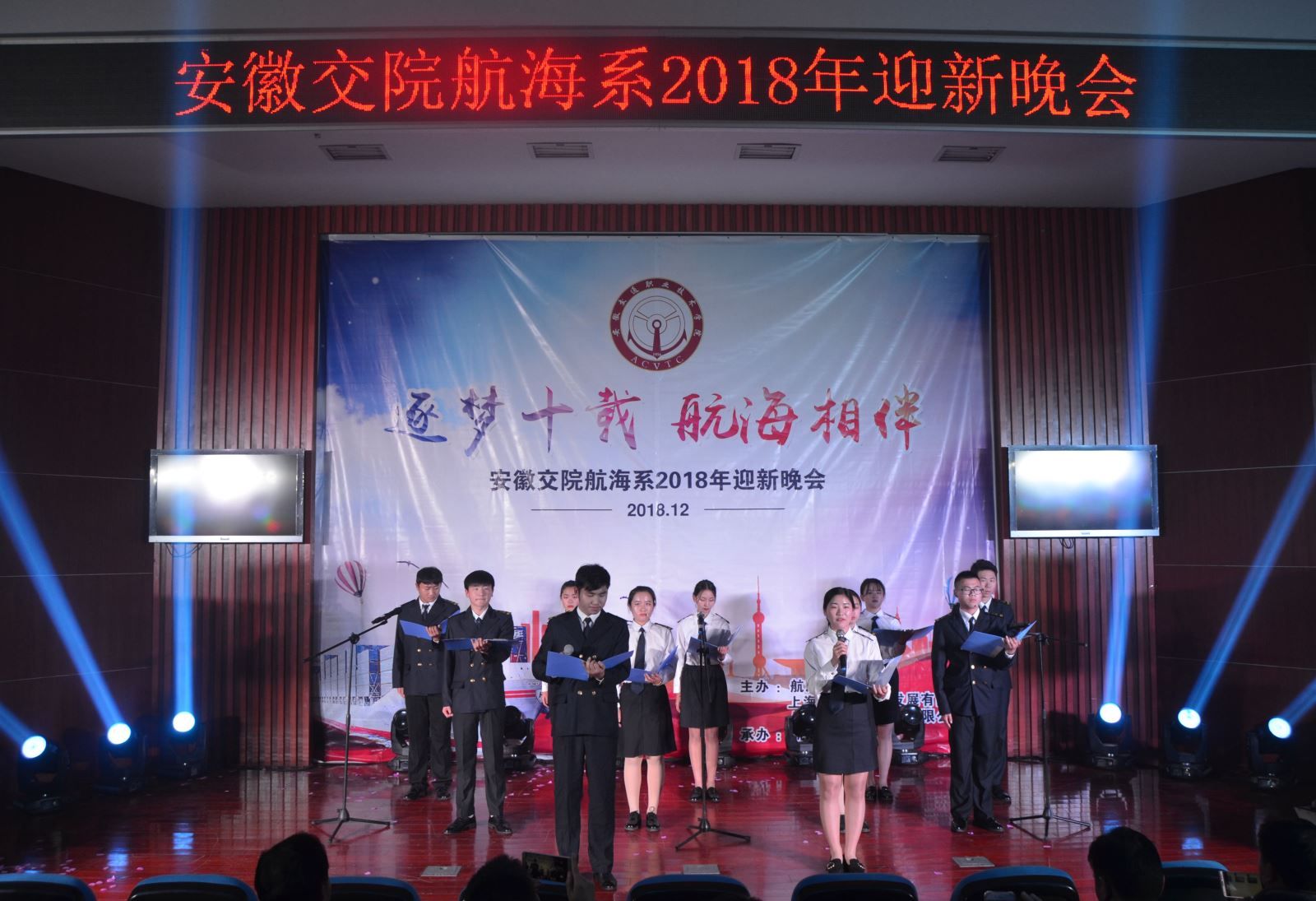 12月16日晚,由航海系團(tuán)總支、上海金水灣航運(yùn)發(fā)展有限公司、上海中船海員管理有限公司主辦,航海系學(xué)生會承辦的2019年迎新晚會在八角樓開幕。合作企業(yè)中船公司陳華建輪機(jī)長、金水灣公司張保安輪機(jī)長出席并祝詞。院紀(jì)委書記陳明、航海系主任雷長森、系支部書記朱蓉及師生們共同觀看了晚會。