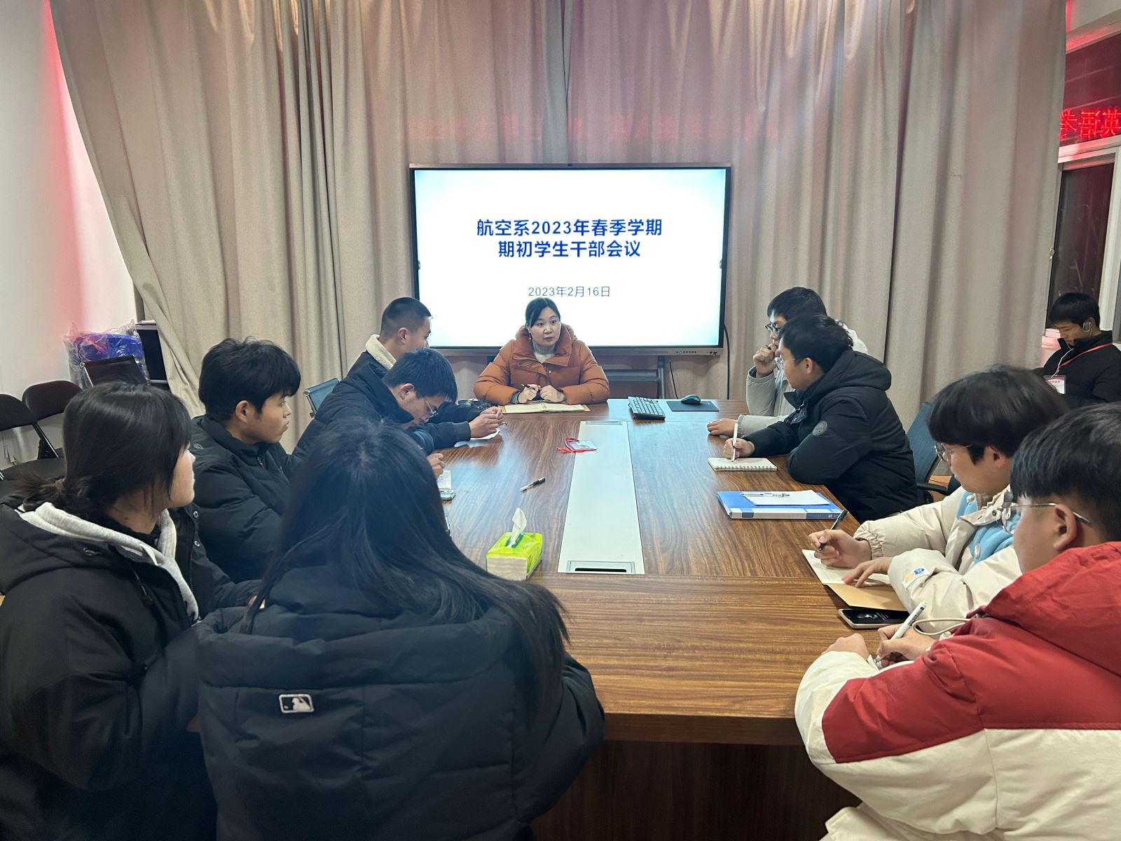 為進(jìn)一步加強(qiáng)學(xué)生干部的整體素質(zhì)和工作能力,充分調(diào)動積極性,為本學(xué)期學(xué)生工作打下堅實基礎(chǔ),2月16日晚,航空系在會議室召開2023年春季學(xué)期期初學(xué)生干部會議。會議由系黨支部副書記趙婧主持,全系主要學(xué)生干部參加了會議。