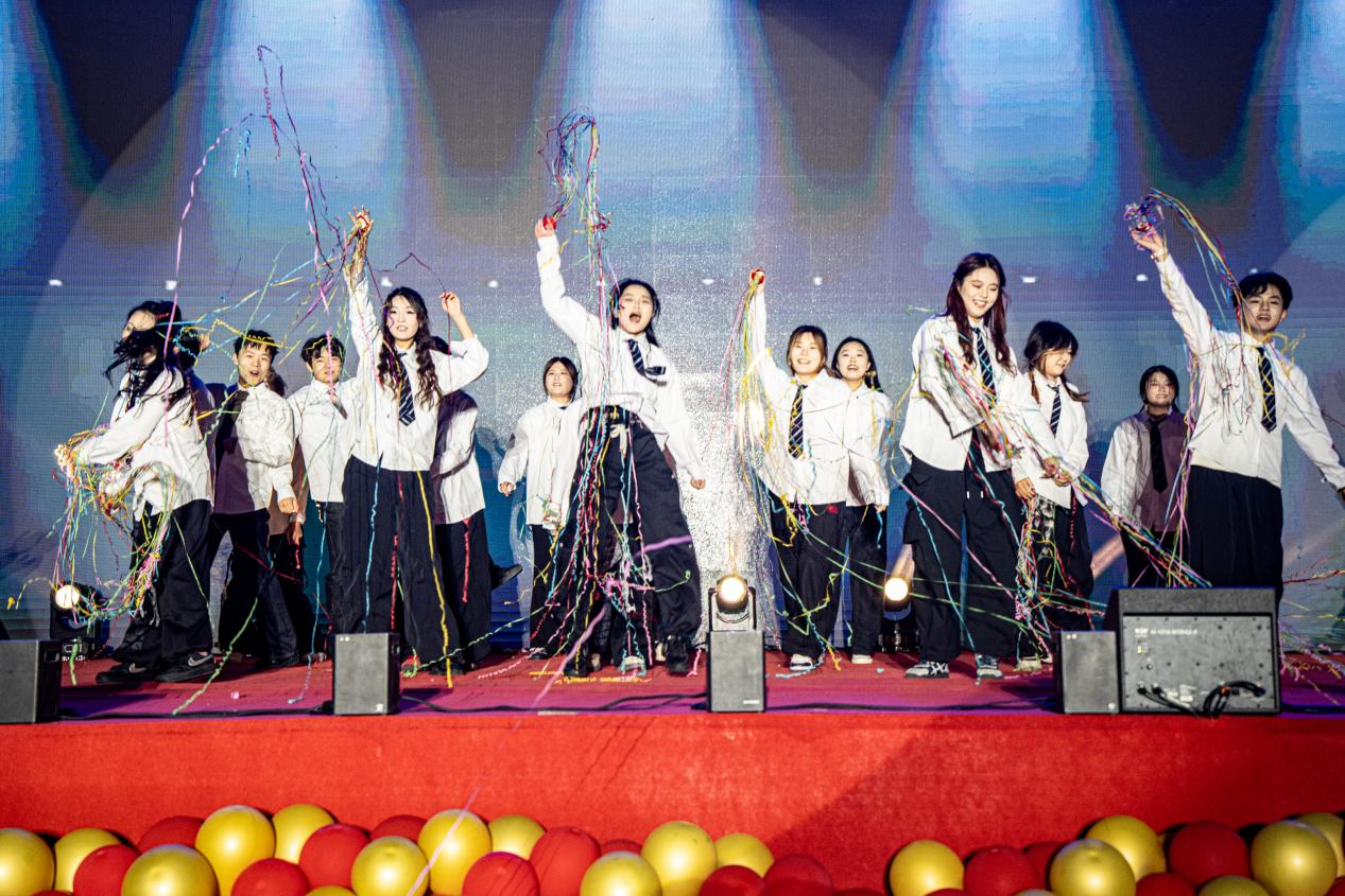 舞臺上,舞步交織出斑斕色彩,合唱與民族舞共演的《銘記》飽含深情,“同行” 的青春熱意在并肩起舞間愈發濃烈,青春脈搏與時代鼓點同頻共振。《青春奔跑》方陣踏響奮進節奏,聯歡會最終以《我愛你中國》大合唱收尾,用嘹亮歌聲書寫向光而行的青春誓言,彰顯家國情懷。