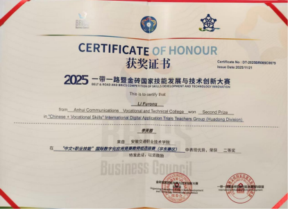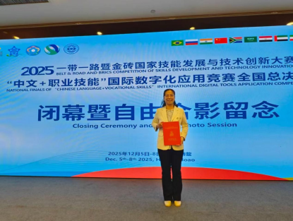 12月6日至8日,2025“一帶一路”暨金磚國家技能發展與技術創新大賽——“中文+職業技能”國際數字化應用競賽全國總決賽在海南博鰲成功舉辦。我校土木建筑學院教師李芙蓉憑借出色表現,在賽事中斬獲全國總決賽教師組三等獎,為學校贏得榮譽,彰顯了我校在“中文+職業技能”領域的教學實力。