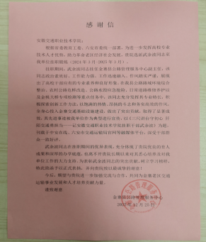 胡先武代表金寨縣交通運(yùn)輸局對我校的支持表示衷心感謝。他指出,此次捐贈的智能交通安全設(shè)備已應(yīng)用于金寨縣S245道路K305+580路段,自運(yùn)行以來有效預(yù)防了交通事故,提升了道路通行效率,增強(qiáng)了區(qū)域交通管理能力。胡先武還充分肯定了武余波老師在掛職期間的工作表現(xiàn)與貢獻(xiàn),并對我校長期關(guān)注和支持革命老區(qū)交通事業(yè)發(fā)展表達(dá)了誠摯謝意。
