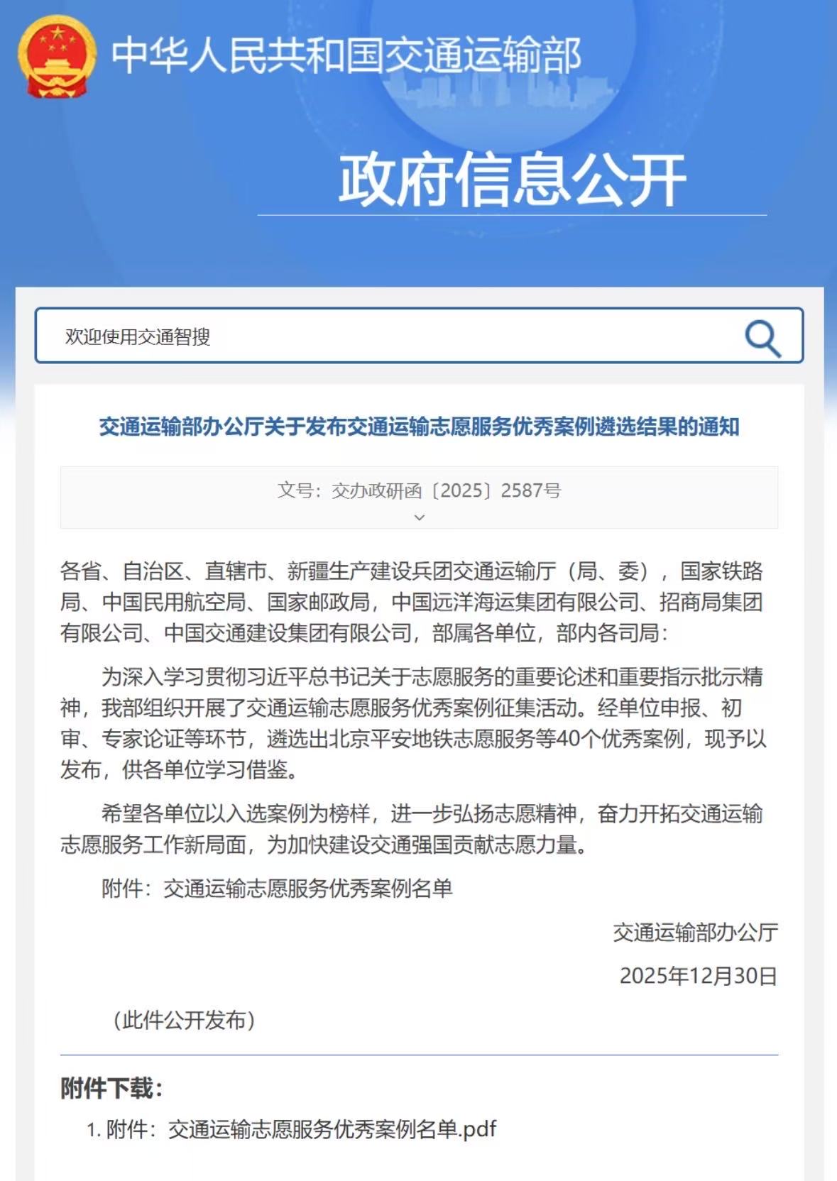 近日,中華人民共和國交通運輸部辦公廳發布交通運輸志愿服務優秀案例遴選結果。