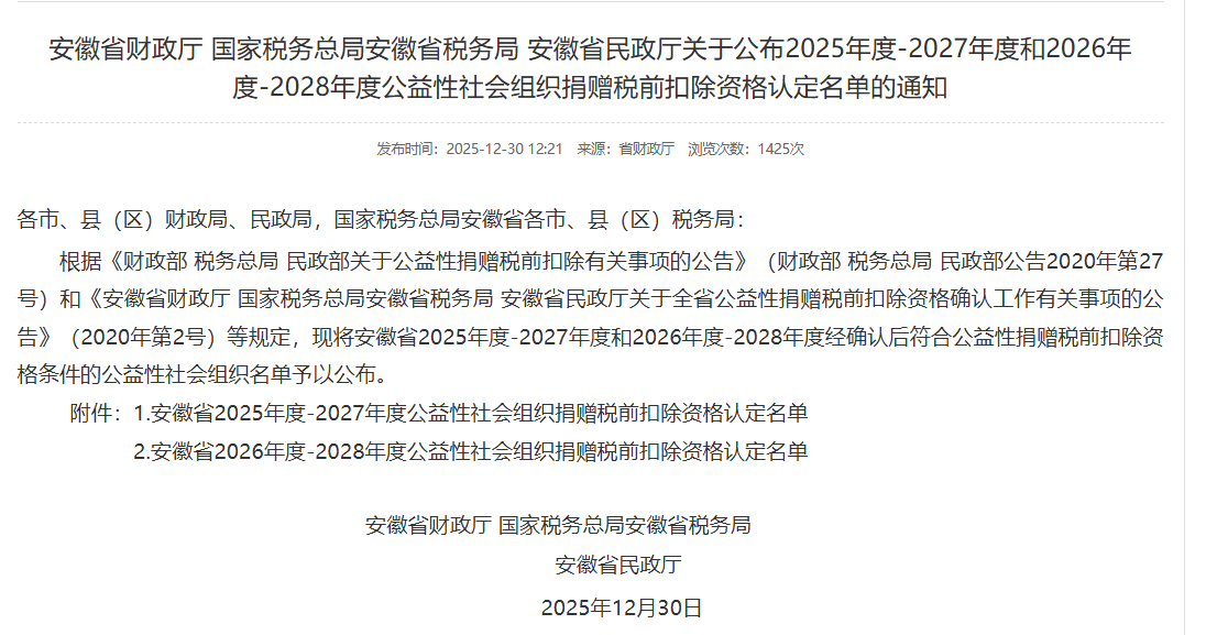 近日,安徽省財政廳、國家稅務總局安徽省稅務局、安徽省民政廳聯(lián)合發(fā)布《安徽省關于公布2025年度-2027年度和2026年度-2028年度公益性社會組織捐贈稅前扣除資格認定名單的通知》。經嚴格審核與綜合評估,安徽交通職業(yè)技術學院教育基金會成功入選安徽省2025年度-2027年度公益性社會組織捐贈稅前扣除資格認定名單。