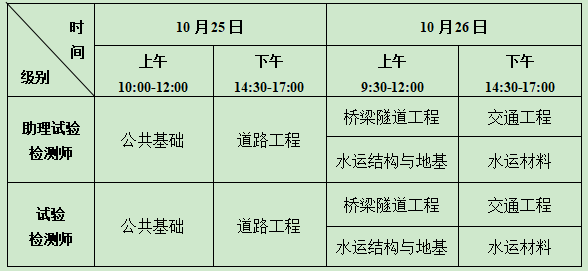 2025年公路水運工程試驗檢測專業(yè)技術(shù)人員職業(yè)資格考試日期為10月25日至26日,分為助理試驗檢測師、試驗檢測師兩個級別,每個級別設(shè)公共基礎(chǔ)和專業(yè)科目,專業(yè)科目為道路工程、橋梁隧道工程、交通工程、水運結(jié)構(gòu)與地基和水運材料,具體安排如下。