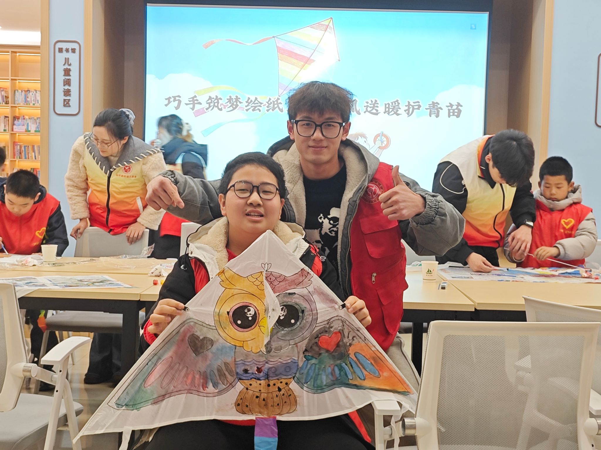 活動現場,志愿者們與社區的孩子們圍坐在一起,共同開啟手繪風箏的趣味之旅。從調配色彩到勾勒上色,從耐心指導到攜手創作,志愿者們手把手帶著孩子們在空白的風箏上繪制靈動的貓頭鷹、活潑的獨角獸……每一抹色彩都傳遞著陪伴與關愛。此句無錯誤。在完成手繪創作后,志愿者們細心清潔桌面,整理活動場地,用細致行動踐行雷鋒精神。活動尾聲,孩子們高舉親手繪制的風箏,與志愿者們合影留念,臉上洋溢著自豪與喜悅。