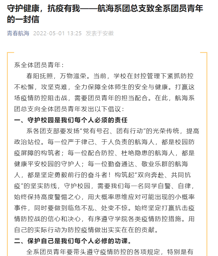 5月1日航海系團總支通過微信公眾號發布《守護健康,抗疫有我--致全系團員青年的一封信》,并在學生生活區、公示欄張貼。要求航海系各團支部、全系團員青年充分展現黨的助手和后備軍的擔當,充分展現青年生力軍和突擊隊的作為,挺身而出,積極配合校園疫情防控措施,為堅決打贏疫情防控阻擊戰貢獻力量。