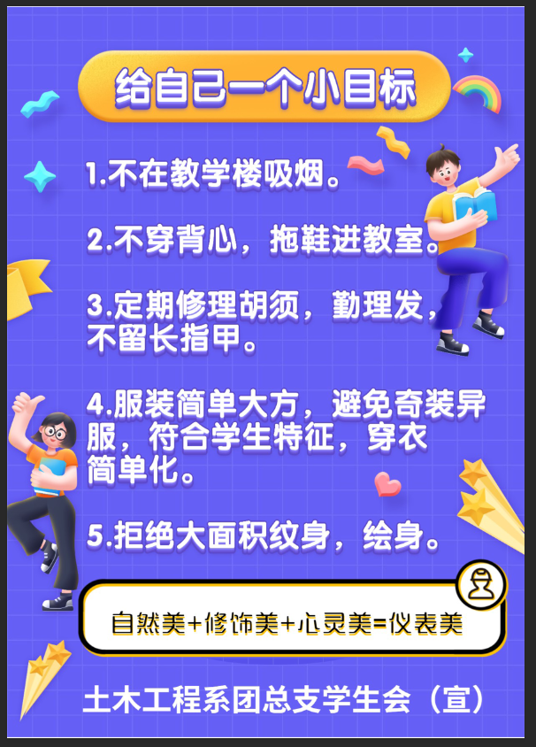 活動(dòng)以“給自己一個(gè)小目標(biāo)”為題,倡導(dǎo)學(xué)生:1.不要在教學(xué)樓吸煙;2.不穿背心、拖鞋進(jìn)教室; 3.勤修理胡須、勤理發(fā)、不留長(zhǎng)指甲; 4.服裝簡(jiǎn)單大方,避免奇裝異服符合學(xué)生特征,穿衣簡(jiǎn)潔; 5.拒絕大面積紋身、繪身等明顯提升同學(xué)精神面貌的要求 ,并提出了自然美+修飾美+心靈=儀表美的理念 。