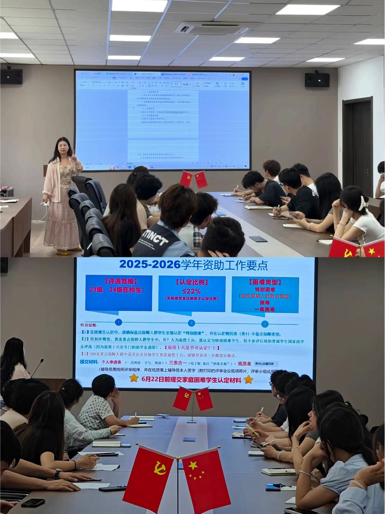在資助政策“兩節課”宣傳工作部署環節,以“兩節課”為載體,面向23、24級在校生,通過資助工作要點幫助學生全面了解資助流程,確保獎助工作落實落細。本學年家庭經濟困難學生資助覆蓋面進一步擴大,班級資助認定比例提至22%左右,充分體現了學院對經濟困難學生群體的關懷與保障。“兩節課”政策宣導中著重強調了資助工作遵照程序的嚴肅性,各班務必成立由輔導員、學生代表組成的評議小組,嚴格審核材料,杜絕虛報錯報現象,合理合規推進資助工作的開展。