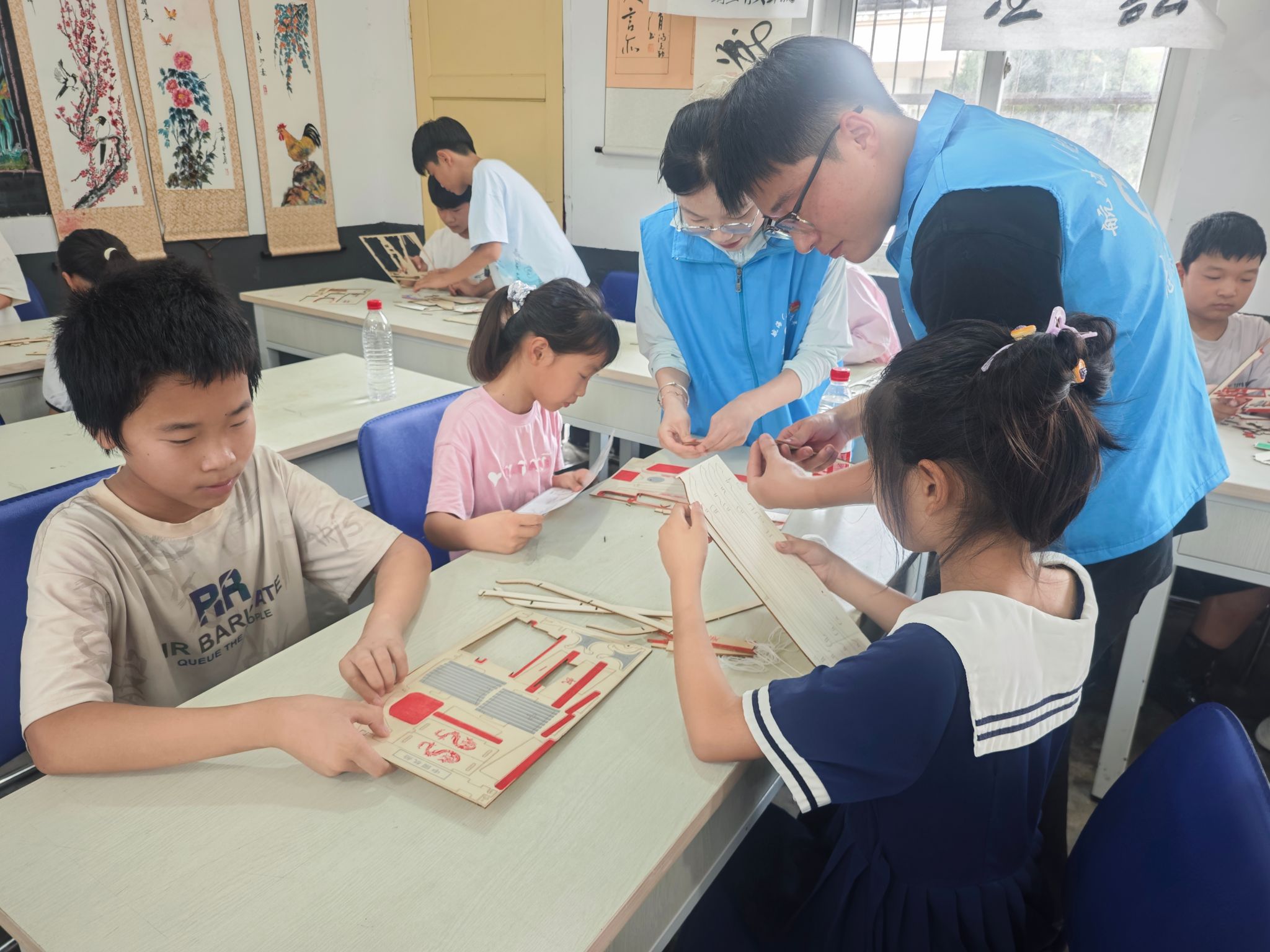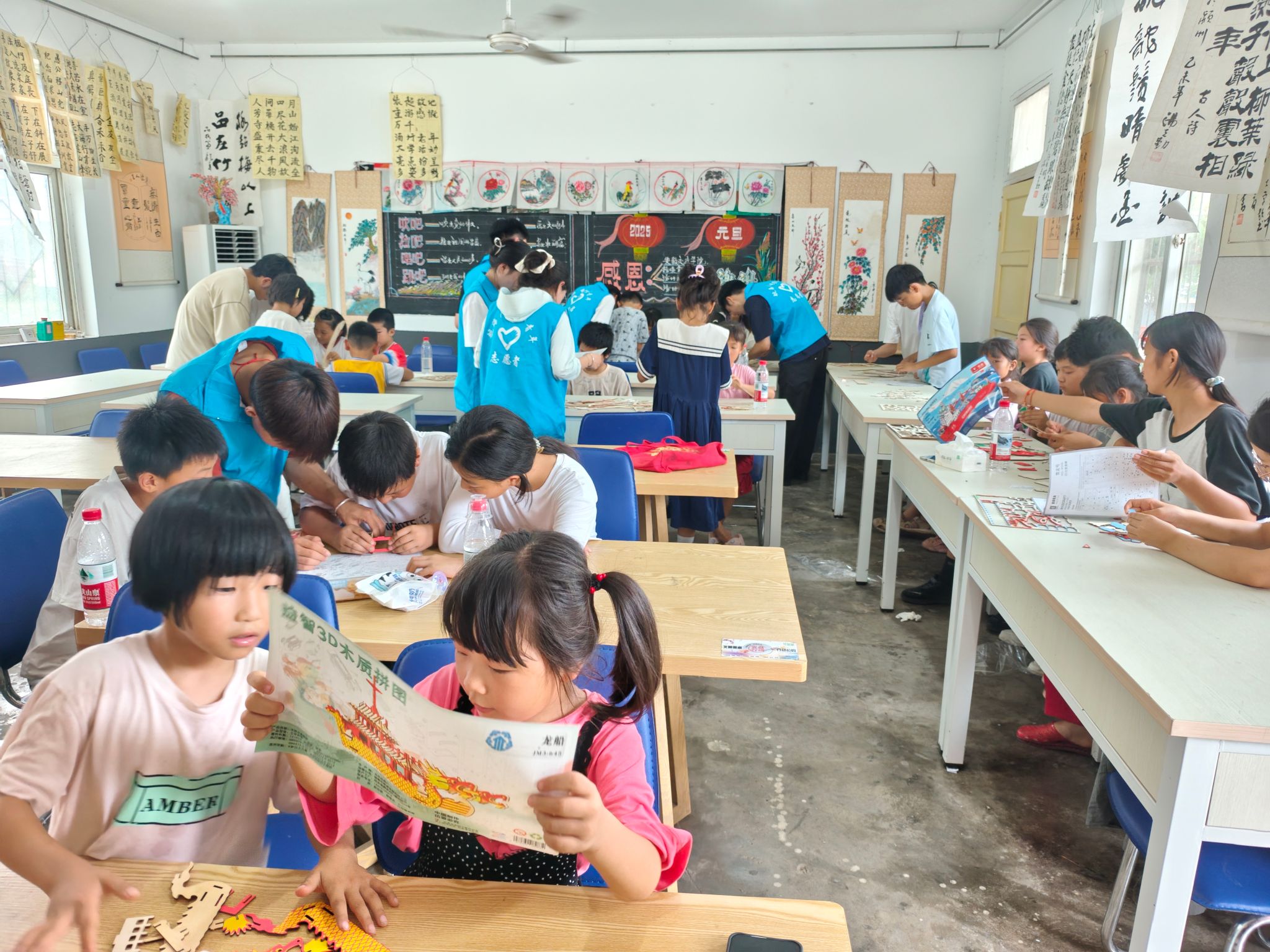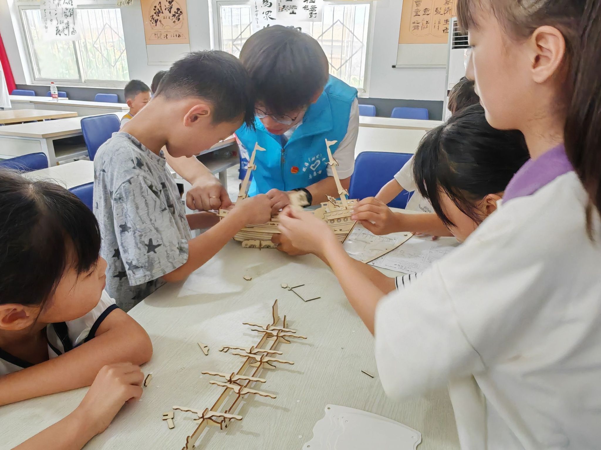 船舶模型制作與游戲體驗活動現場氣氛熱烈,成為當日的“人氣焦點”。志愿者帶領鄉村兒童共同制作南湖紅船、雪龍號破冰船、海軍驅逐艦等具有象征意義的船舶模型,在拼裝、調試的實踐過程中,講解船舶浮力原理與結構力學知識,讓小朋友親身感受科技魅力與工匠精神。模型試航環節中,小小“航海家”們在志愿者指導下操控船只,直觀理解航行規律。隨同開展的投壺、套圈等趣味游戲融入團隊協作理念,孩子們在歡聲笑語中增強了集體榮譽感,實現了“寓教于樂”的育人目標。