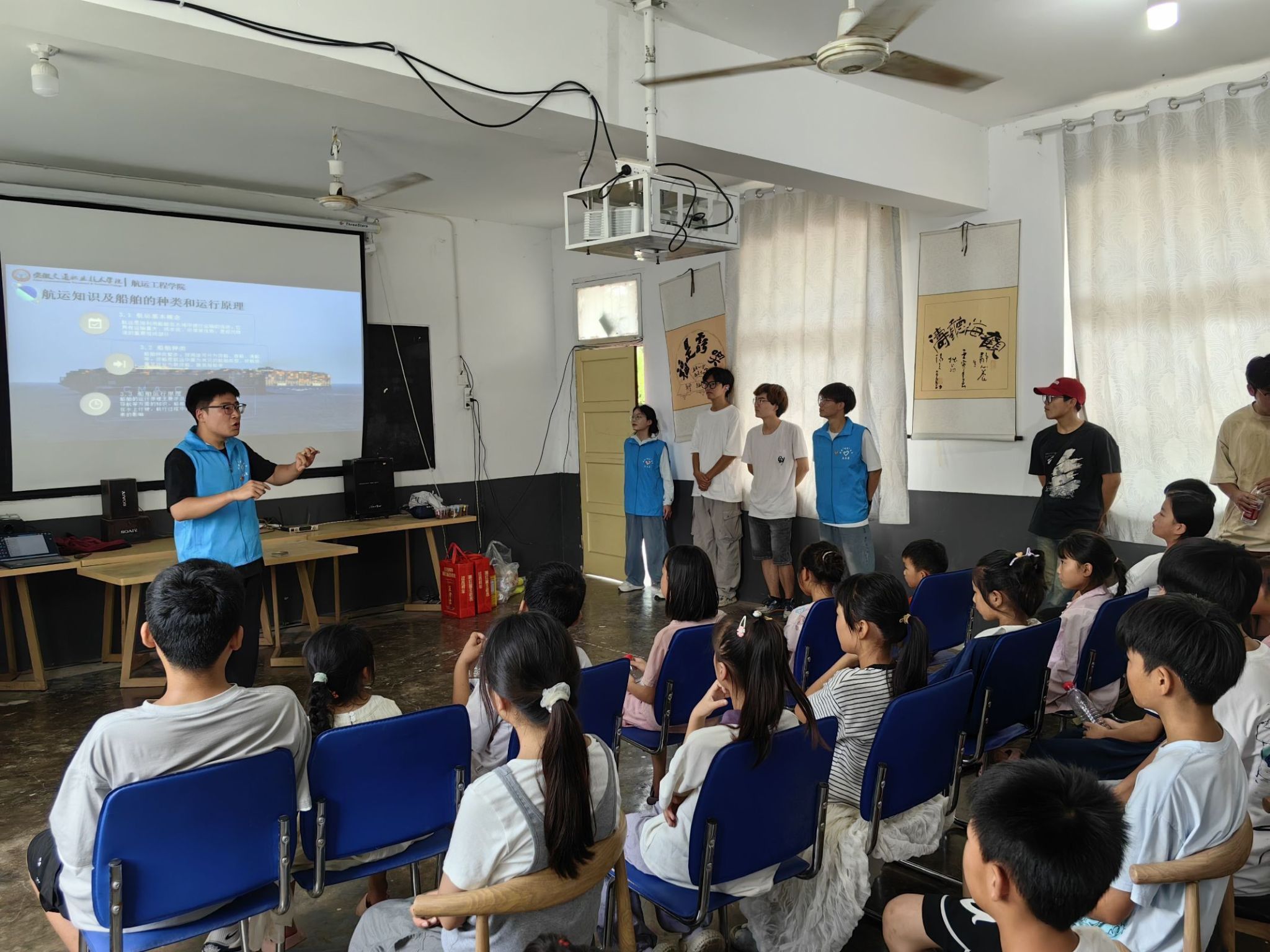 7月16日下午,湯圩村小學的教室內熱鬧非凡,一場別開生面的航運知識小課堂在此拉開帷幕。學院志愿者充分發揮專業優勢,以“航運聯通世界,夢想點亮未來”為主線,通過生動有趣的航海故事、直觀形象的動畫短片,系統講解船舶分類、構造原理及航行奧秘,深入淺出闡釋航運在國民經濟發展、民生保障中的重要作用。孩子們眼中閃爍著好奇的光芒,在互動問答中探索藍色國土的無限可能,一顆顆“航海夢”的種子在鄉村沃土中悄然萌發。