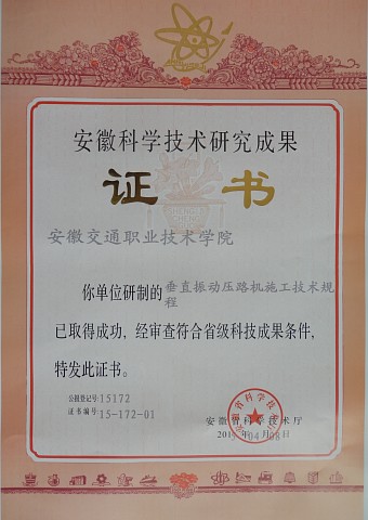 2015年4月,汽車系承擔的安徽省交通科技進步計劃科研項目——安徽省地方標準《垂直振動壓路機施工技術規程》被鑒定為安徽省“省級科技成果”。