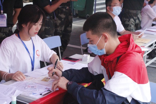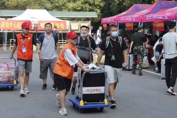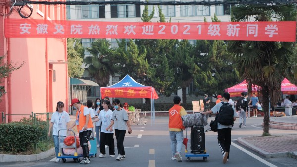 校園外,火車站、汽車站、高鐵南站分別設立了接待點,來幫助新生及隨行人員并指引他們到校。校園內,彩旗招展,橫幅飄飄,傳達著師生們對前來報到新生的親切問好。