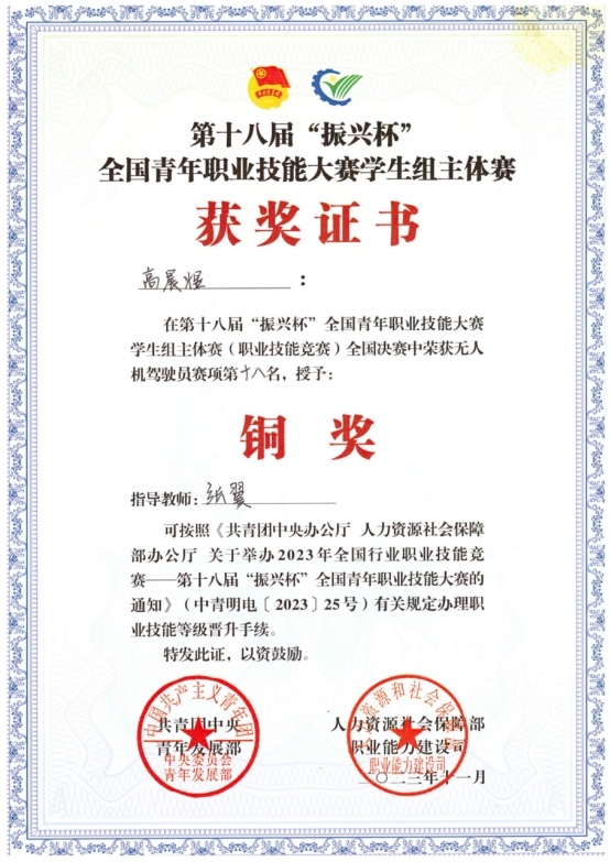 11月25日至28日,由共青團中央和人力資源社會保障部聯合舉辦的2023年全國行業職業技能競賽——第十八屆“振興杯”全國青年職業技能大賽在杭州成功舉辦。大賽聚焦新職業、新領域,首次設置無人機駕駛員等新工種賽項,進一步提升青年學生的技能水平,適應市場發展需求。我院汽車與機械工程系22無人機班的高晨煜同學在無人機駕駛員賽項中表現優異,榮獲銅獎,將被授予“全國青年崗位能手”稱號。