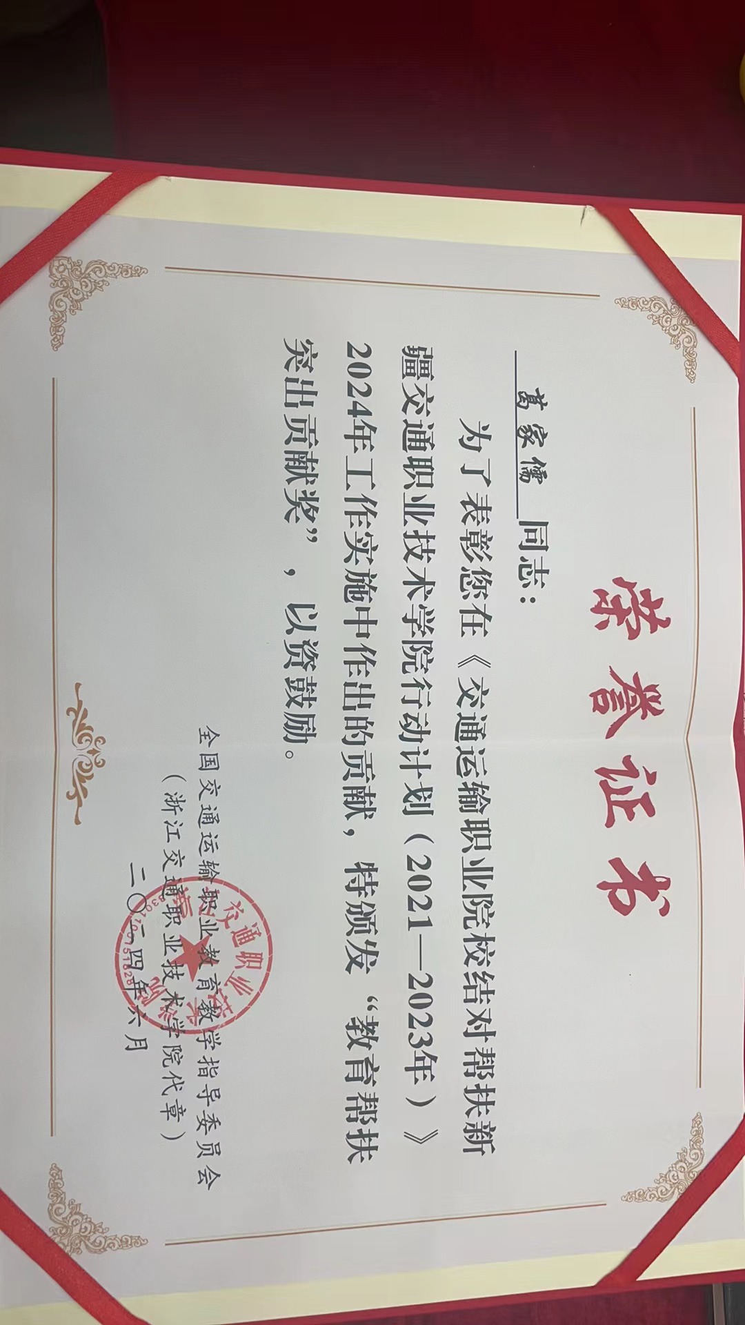 會上,新疆維吾爾自治區交通運輸廳二級巡視員孔令忠致辭,新疆交通職業技術學院黨委書記王瀚全面總結和回顧第三輪交通運輸職業教育結對幫扶的經驗和成效,援疆院校及援疆教師代表做發言。會議表彰了第三輪“教育幫扶貢獻獎”單位和第六期“教育幫扶突出貢獻獎”教師,我院榮獲“教育幫扶貢獻獎”,葛家儒榮獲“教育幫扶突出貢獻獎”。
