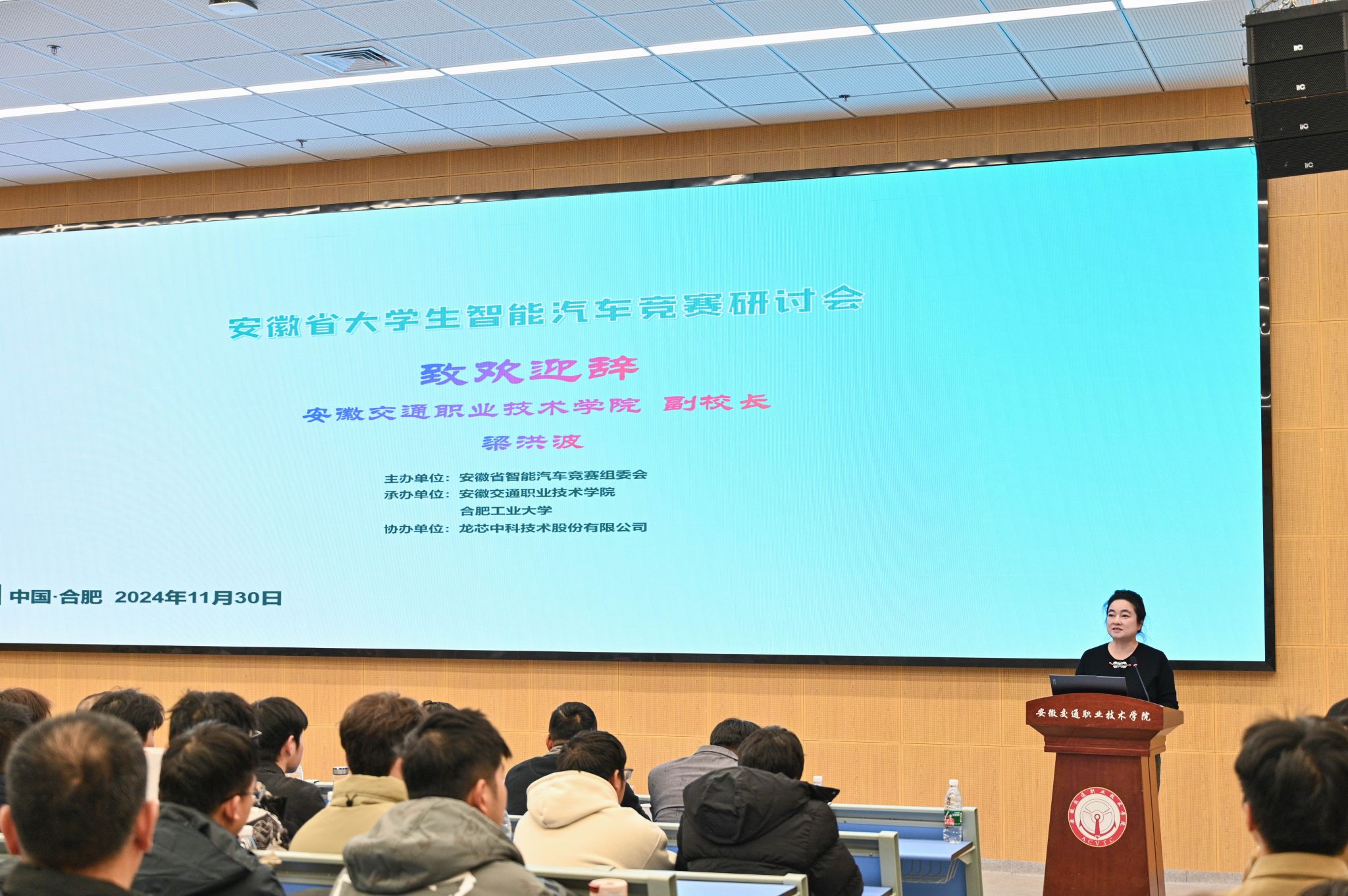 梁洪波在致辭中表示,熱烈歡迎來自全省各高校的領導、優秀指導教師和優秀學子相聚一堂,共同探討第二十屆全國大學生智能汽車競賽安徽賽區的舉辦工作,這對于我們學院來說,既是一次難得的學習機會,也是一份沉甸甸的責任。我們深知,承辦這樣一項高水平的活動,對于促進學院的學科建設、提升教育教學質量具有重要意義。