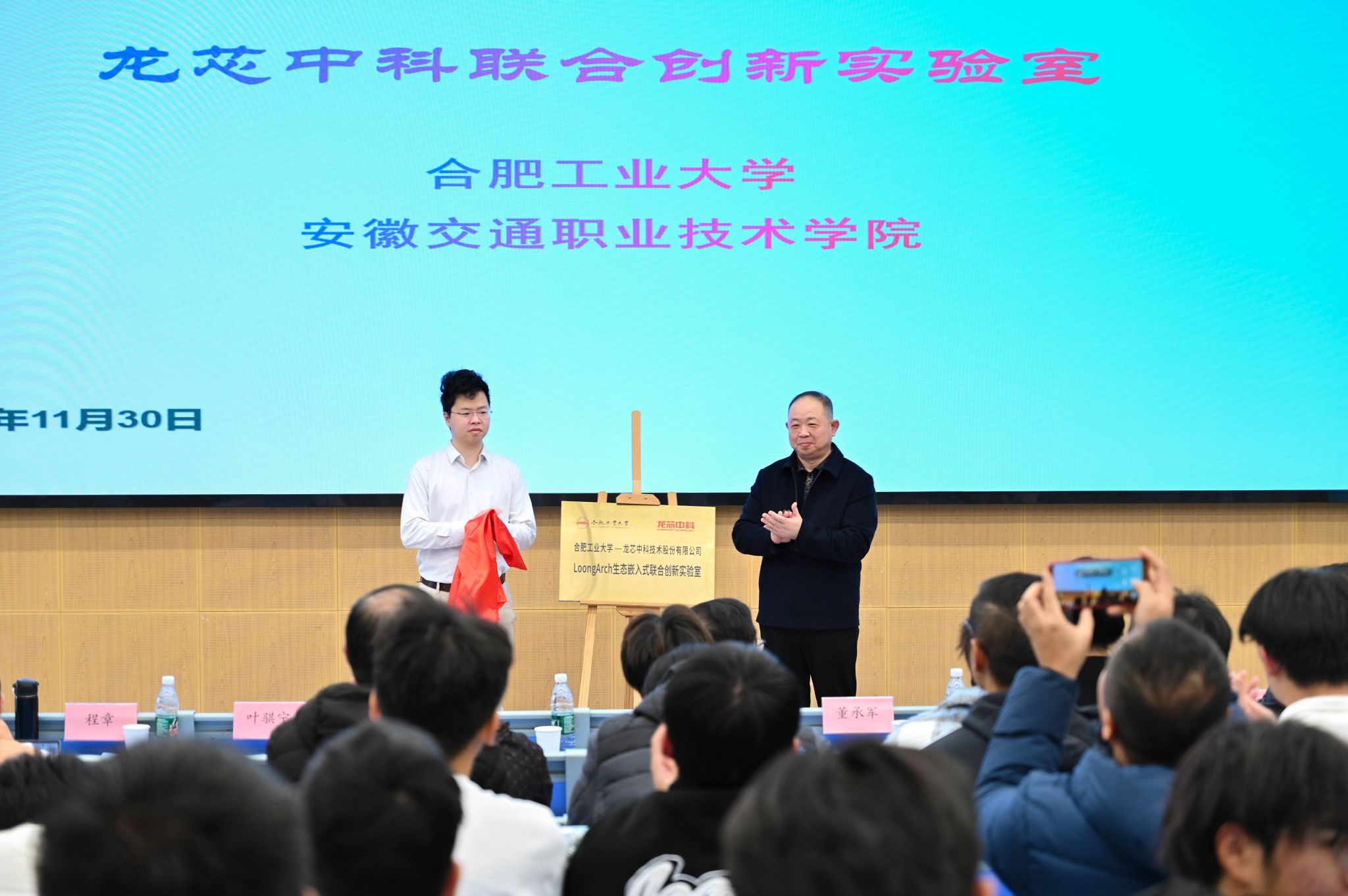 隨后,在與會人員的共同見證下,安徽省大學生創新創業教育辦公室董承軍主任與龍芯中科嵌入式生態平臺葉騏寧總監共同為合肥工業大學-龍芯中科技術股份有限公司LoongArch生態嵌入式聯合創新實驗室揭牌。