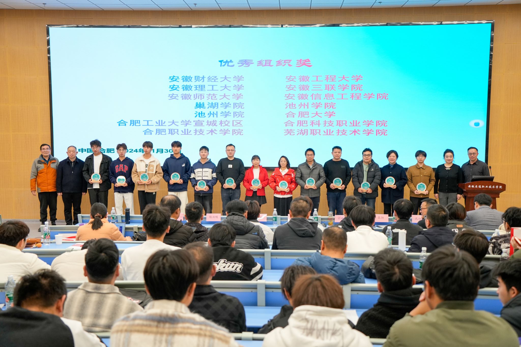 會上舉行了2024年安徽省大學生智能汽車競賽組織貢獻獎頒獎典禮,參會領導給2024年組織貢獻獎的單位頒發了獎杯。旨在表彰為上一屆在智能汽車競賽組織工作中做出突出貢獻的單位。
