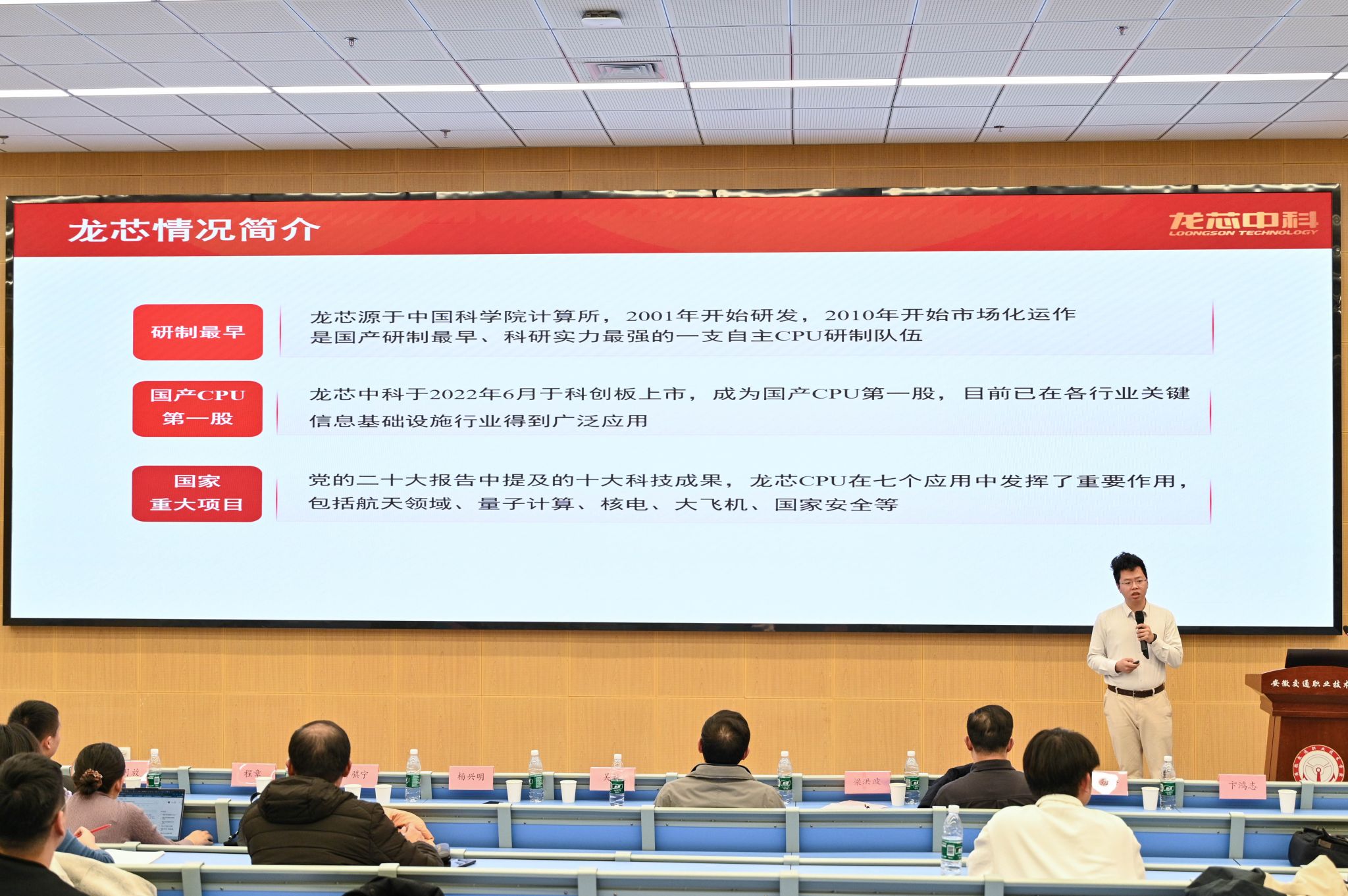 安徽省大學生創新創業教育辦公室董承軍主任、安徽省大學生智能汽車競賽秘書長吳曄、安徽交通職業技術學院黨委委員、副院長梁洪波出席大會并致辭。參會的還有安徽省大學生智能汽車競賽副秘書長楊興明、副秘書長張陽、龍芯中科技術股份有限公司嵌入式生態平臺葉騏寧總監、安徽交通職業技術學院汽機系黨總支書記沈勁松、安徽交通職業技術學院汽機系副主任程章、龍芯中科技術股份有限公司嵌入式華東區經理卞鴻志、安徽交通職業技術學院汽機系教師代表梁月放,大會由楊興明主持。來自安徽省內40余所高校師生齊聚一堂共同探討安徽省大學生智能汽車競賽的創新與發展。