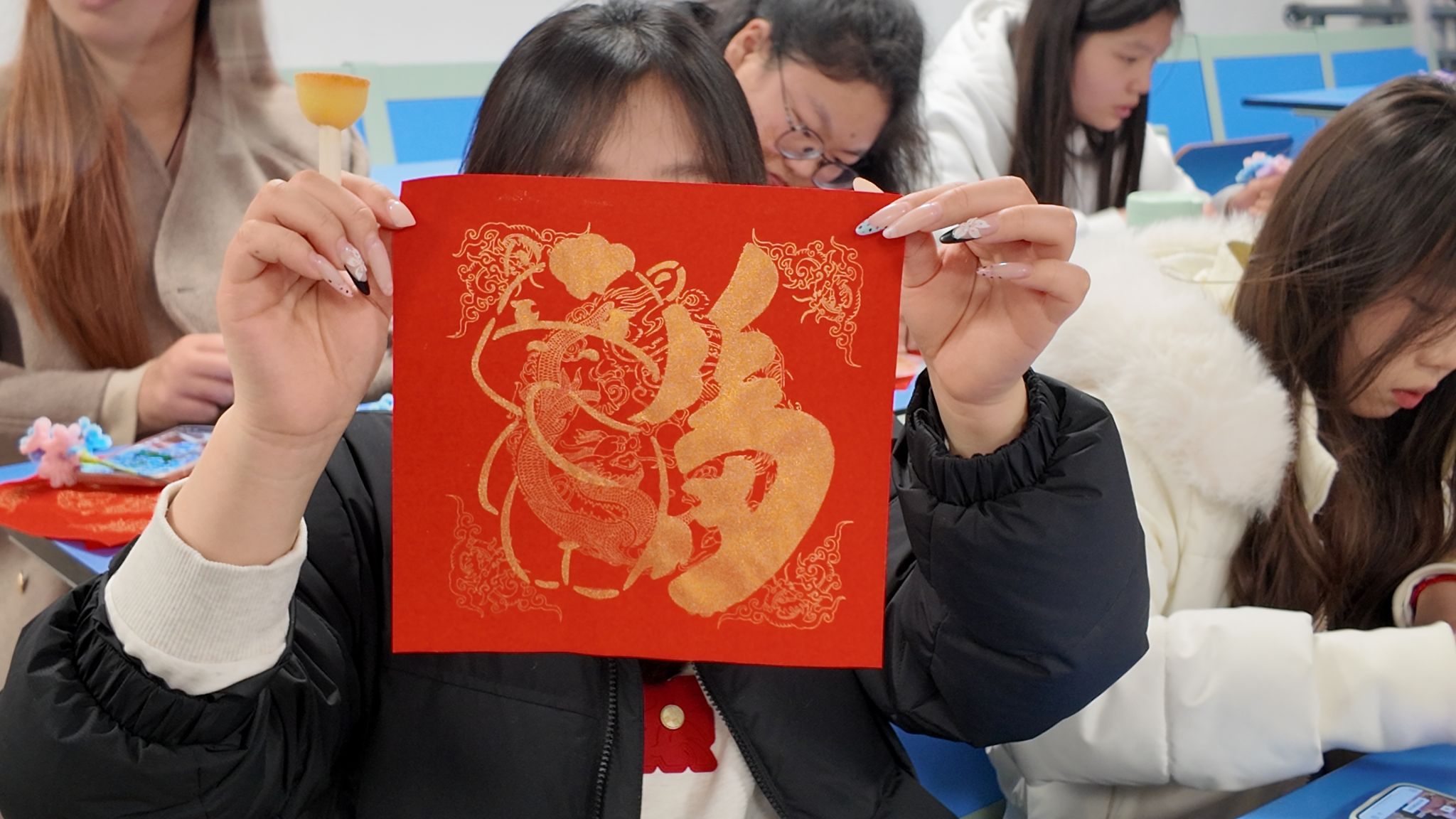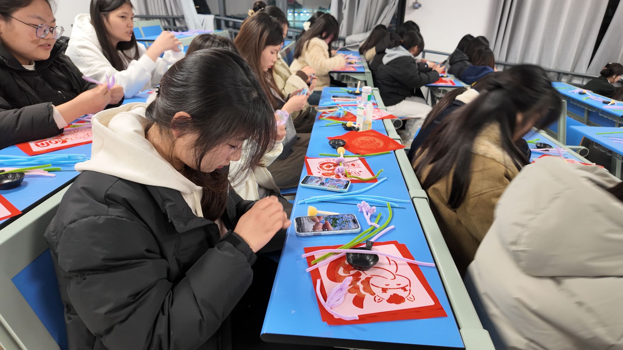 活動中,師生共同體驗傳統拓印、剪紙技藝,在實踐中感受非遺文化魅力,領略中華優秀傳統文化的深厚底蘊。學生們懷著感恩之心,精心制作扭扭棒郁金香花朵,親手獻給女教師,以真摯心意表達對老師的尊敬與祝福。