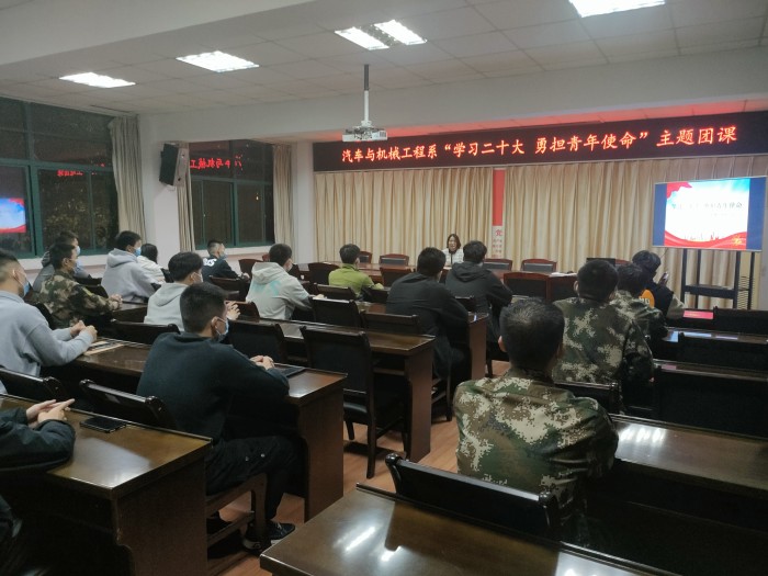 為深入學習貫徹黨的二十大精神,加強學生干部隊伍思想建設,進一步引領廣大青年學生堅定跟黨走的理想信念,11月26日晚,汽車與機械工程系組織開展“學習黨的二十大精神”主題團課,團課由系團總支書記鐘飛飛主持,系二十三屆學生會全體學生干部參加了此次學習。