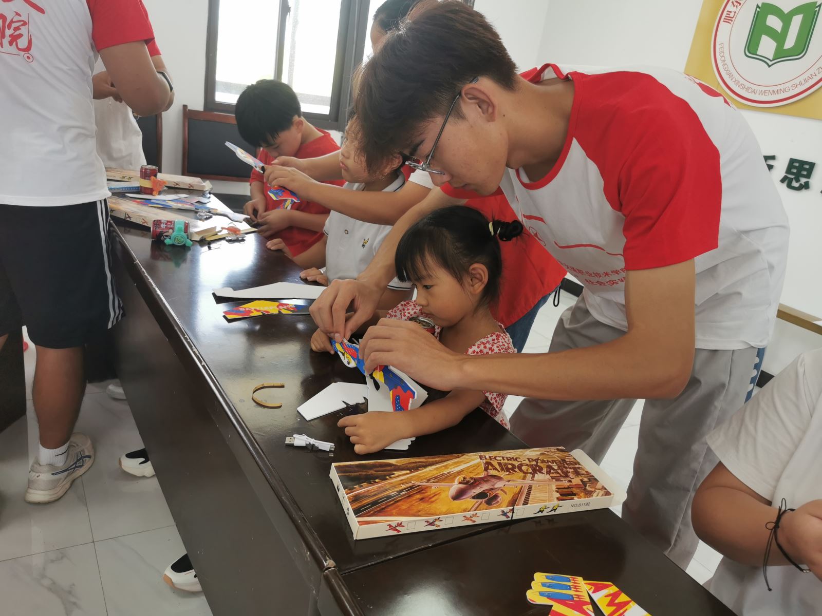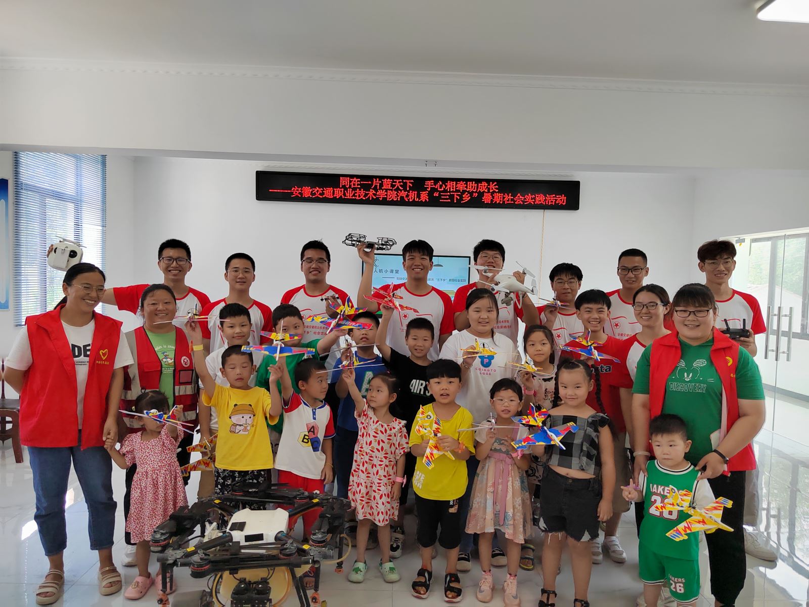 為守護留守兒童安全,拓寬留守兒童視野,8月3日上午,實踐團在村委辦公室開展了“同在一片藍天下 手心相牽助成長”活動。安全知識教育環節中,同學們結合PPT、知識問答、動畫視頻、改編兒歌等方式為小朋友們講解了交通安全、消防安全、防溺水、防拐騙等知識。無人機小課堂里,同學們為小朋友們科普了什么是無人機、無人機的分類及應用領域等知識,并讓大家近距離觀察無人機,認識無人機的主要結構及用途,精彩的無人機表演更是讓小朋友看得入迷,激發了他們學習航空航天知識,探索科學世界的熱情。最后,實踐團給大家分發了電動紙飛機,手把手教小朋友拼裝,拉近了彼此的距離,讓小朋友們在快樂中學習成長。