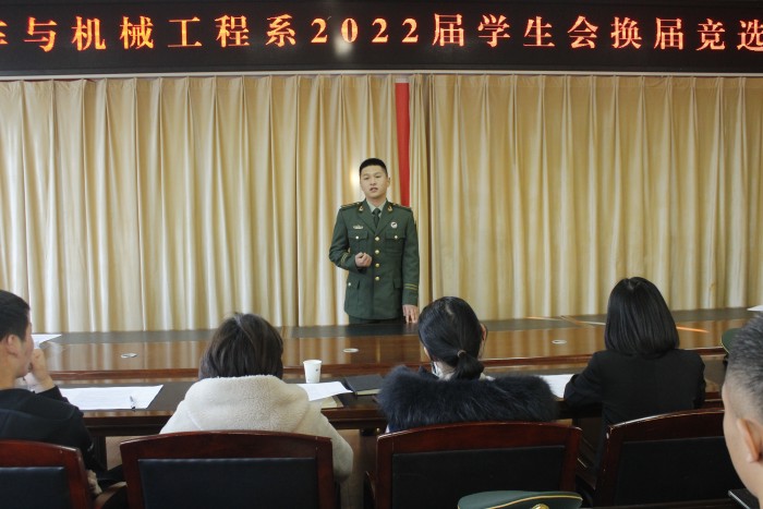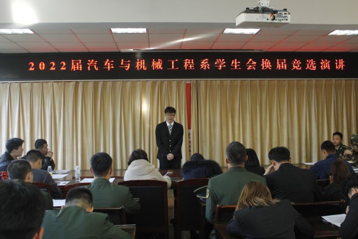 為了進一步加強我系學生會干部隊伍建設,為系學生會注入新鮮血液,12月1日下午,汽車與機械工程系2022屆學生會換屆競選演講在系三樓會議室舉行,系團總支書記鐘飛飛、主任輔導員趙婧、黨政秘書吳秀秀老師及系2021屆學生會主要負責人擔當了本次競選演講的評委。