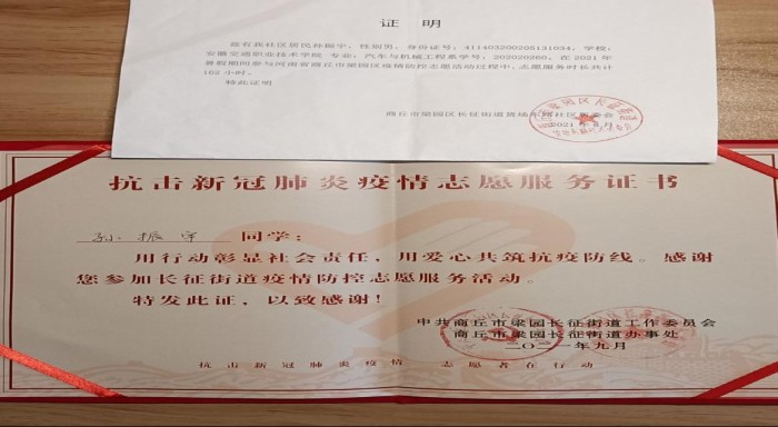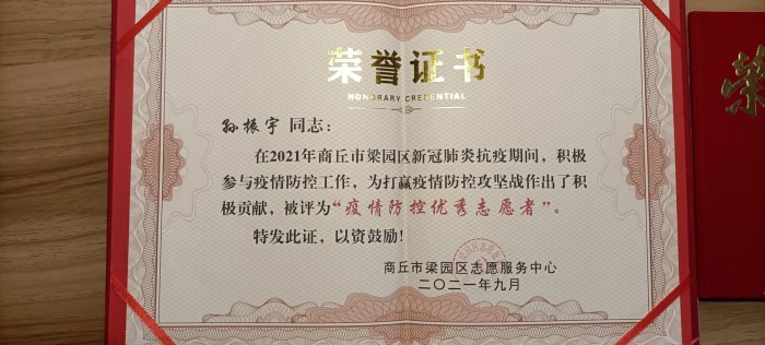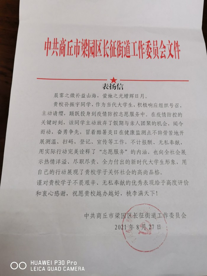 志愿服務(wù)結(jié)束后,商丘市梁園區(qū)街道發(fā)來表揚信,信中說道“孫振宇用實際行動完美詮釋了‘志愿服務(wù)’的內(nèi)涵,向全社會展示熱情洋溢、盡職盡責(zé)、全力付出的新時代大學(xué)生形象,用自己的行動展現(xiàn)了貴校學(xué)子關(guān)懷社會的高尚品格。”