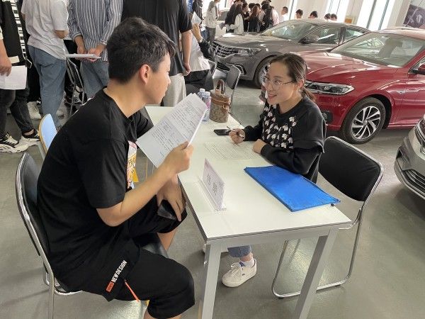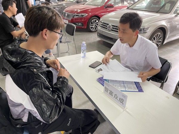 下午2點招聘會正式開始,19級大眾定向班共計75名同學躍躍欲試,現場氣氛熱烈,有意向學生駐足企業招聘席位前,與企業代表進行了深入的交流。經過經銷商的初輪面試,最終有41名同學與用人單位達成初步的實習錄用意向。招聘會后,學院將根據招聘情況組建“上汽大眾”訂單班。