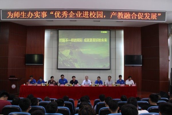 隨后,張松松作題為《挖掘不一樣的精彩,成就更美好的未來(lái)》的講座,分別介紹了徐工集團(tuán)、徐工挖機(jī)事業(yè)部、徐工挖機(jī)同盟軍及校企合作儲(chǔ)鷹計(jì)劃。對(duì)徐工集團(tuán)“擔(dān)大任、行大道、成大器”的核心價(jià)值觀,以及系列產(chǎn)品研發(fā)與規(guī)劃做了詳細(xì)解讀,帶領(lǐng)大家一起走進(jìn)了徐工集團(tuán)與國(guó)家發(fā)展同頻共振的歷史記憶與宏偉藍(lán)圖。期間,他還與大家分享了習(xí)近平總書(shū)記2017年12月12日親臨徐工視察的美好畫(huà)面。王啟介紹了安徽中建作為徐工挖機(jī)的同盟軍的發(fā)展?fàn)顩r及用人需求。沈迎賓為同學(xué)們分享了自己的成功經(jīng)驗(yàn),用自身的經(jīng)驗(yàn)來(lái)教育和引導(dǎo)學(xué)弟學(xué)妹們認(rèn)真學(xué)習(xí),踏實(shí)工作。