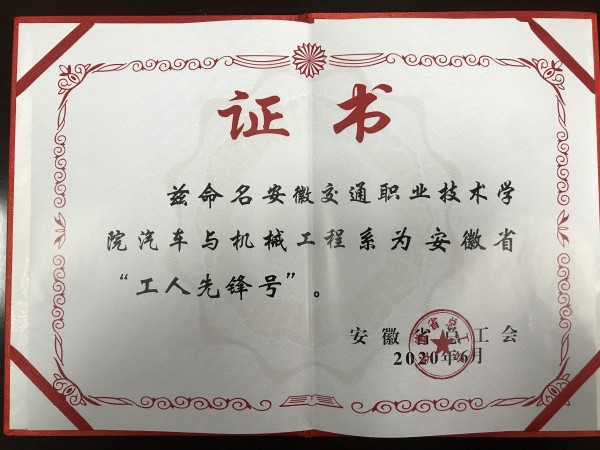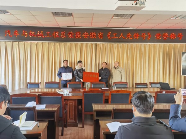 日前,我院汽車與機械工程系被安徽省勞動競賽委員會、安徽省總工會授予“工人先鋒號”榮譽稱號。安徽省“工人先鋒號”是為了表彰全省各類企事業單位中具有時代性、先進性和示范性的部門和組織。1月12日上午,院黨委委員、紀委書記陳明、院工會主席趙彥海為汽車與機械工程系頒發獎牌和命名證書。