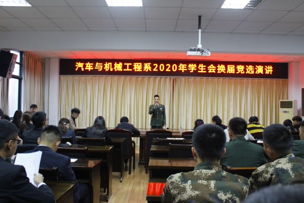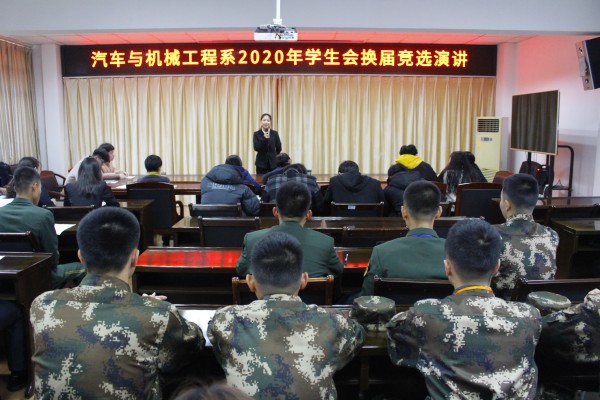 12月3日-4日,汽車與機械工程系團總支于3樓會議室舉行2020年系學生會換屆競選演講。經過前期的自薦、資格審查、筆試等環節,27名同學參加了此次競選演講。
