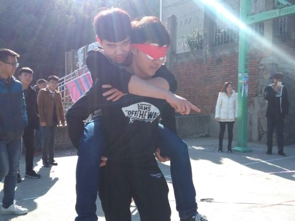 本次活動(dòng)項(xiàng)目趣味性與挑戰(zhàn)性并存,涵蓋“聯(lián)機(jī)籃球、捆綁過關(guān)、瞎子和瘸子”三個(gè)環(huán)節(jié),主要考驗(yàn)同學(xué)們的協(xié)調(diào)合作能力。聯(lián)機(jī)籃球環(huán)節(jié),每輪四支隊(duì)伍,兩支隊(duì)伍合作對(duì)抗另外兩支隊(duì)伍,兩個(gè)人的手腳綁在一起打籃球;捆綁過關(guān)環(huán)節(jié),一隊(duì)三個(gè)人手腳綁在一起,一人倒水,一人拿水給另一人喝,兩人剝糖果給第三人吃;瞎子和瘸子環(huán)節(jié),一人蒙著眼睛背著另外一人,由被背的人指揮踩氣球。盡管天氣寒冷,但同學(xué)們熱情高漲,參賽隊(duì)員一個(gè)個(gè)精神抖擻,遠(yuǎn)離了“低頭族”“手機(jī)黨”“數(shù)碼控”的消極形象,展示了真正屬于年輕人的青春活力,現(xiàn)場十分熱鬧。