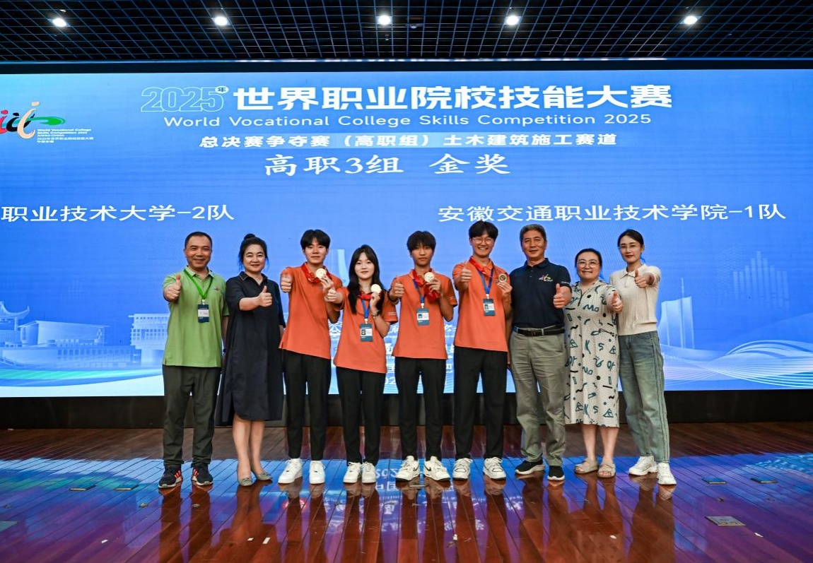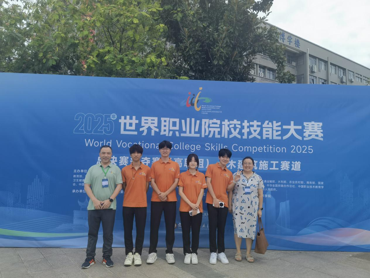 8月26日至31日,2025年世界職業院校技能大賽總決賽爭奪賽土木建筑施工賽道(高職組)盛大啟幕。我院王佳賓、葉生兩位老師指導,由23級市政專業金志健、吳天、余志鵬同學與24級檢測專業楊清琳同學組成的參賽隊伍,以優異成績斬獲金獎。