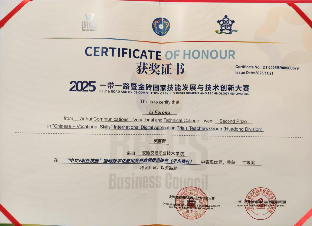 12月6日至8日,2025“一帶一路”暨金磚國(guó)家技能發(fā)展與技術(shù)創(chuàng)新大賽——“中文+職業(yè)技能”國(guó)際數(shù)字化應(yīng)用競(jìng)賽全國(guó)總決賽在海南博鰲成功舉辦。我校土木建筑學(xué)院教師李芙蓉憑借出色表現(xiàn),在賽事中斬獲全國(guó)總決賽教師組三等獎(jiǎng),為學(xué)校贏得榮譽(yù),彰顯了我校在“中文+職業(yè)技能”領(lǐng)域的教學(xué)實(shí)力。