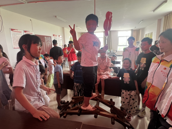 第二堂課上,道路與橋梁工程技術(shù)專業(yè)的學(xué)生代表“刺猬哥哥”以“小小橋梁工程師——神奇的榫卯結(jié)構(gòu)”為題,結(jié)合土木工程系專業(yè)特色,講解常見的幾種橋梁基本結(jié)構(gòu),現(xiàn)場搭建傳統(tǒng)榫卯結(jié)構(gòu)橋梁并解釋原理,邀請孩子們爬上橋梁測試?yán)喂潭炔L試搭建,指導(dǎo)學(xué)生用折紙搭橋小實驗感受“力學(xué)”的美妙,點亮“專業(yè)”夢想。