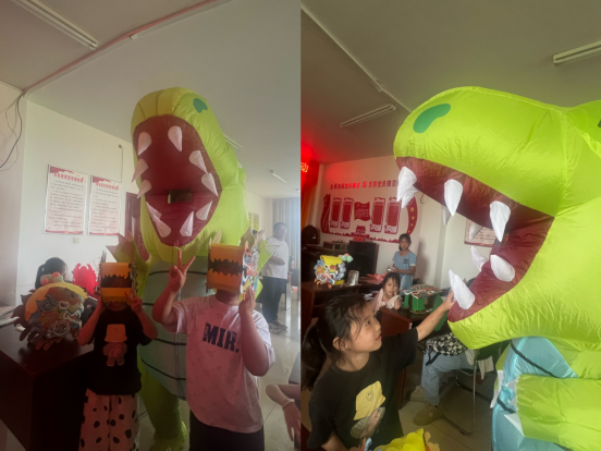 最后一堂課上,“大象哥哥”給孩子們講述了龍在中國傳統(tǒng)文化中極其重要的地位和深遠(yuǎn)的意義,它被視為吉祥的象征,寓意著力量、智慧和好運(yùn)。龍的形象也廣泛出現(xiàn)在建筑、服飾、藝術(shù)品和文學(xué)作品中,成為中華文化的重要組成部分,我們也被稱為“龍的傳人”。隨后心靈手巧的大象哥哥帶著孩子們制作屬于自己的“龍頭”,隨著恐龍哥哥的出場將全場氣氛推到了頂點,孩子們紛紛套上自己制作的龍頭爭相和恐龍哥哥合影,歡聲笑語充滿了整間教室,宛如一個充滿活力和歡樂的童話世界。