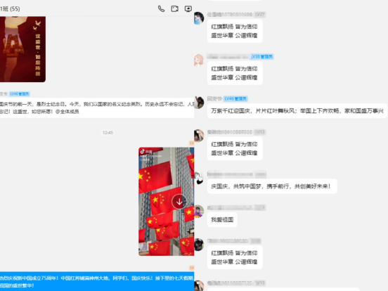 活動期間,學生干部積極參與,他們不僅認真策劃、精心布置,還特地組織了一次重溫入團宣誓的儀式。他們舉起右拳,神情肅穆,再次許下了為共產主義事業奮斗終身的誓言。這一刻,他們的心中充滿了對黨的忠誠和對祖國的熱愛,也更加堅定了為實現中華民族偉大復興的中國夢貢獻青春力量的決心。22/23/24級各班團支書也通過本班群宣傳了本次“愛國說”團日活動厚植家國情懷,青春告白祖國的主題,各位團員和青年積極響應,為祖國送上自己的祝福。
