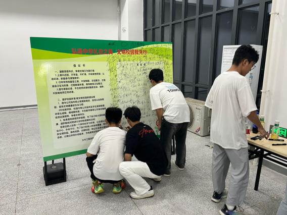 為了增強活動的參與度和影響力,團總支還精心策劃了一場現場倡議書簽字活動。活動當天,師生們紛紛在寫有以上倡議內容的展板上鄭重簽字,承諾將自覺遵守校園文明規范,共同維護良好的校園環境。這一舉動不僅彰顯了土木系師生的責任感和使命感,也為全校師生樹立了榜樣。給身邊的人創造一個良好的學習環境,讓文明禮儀內化于心,外化于行,為了自己和他人的身體健康,努力爭創文明校園、綠色校園、無煙校園,樹立社會責任感和使命感,讓我們共同行動起來,為構建美好校園貢獻力量。