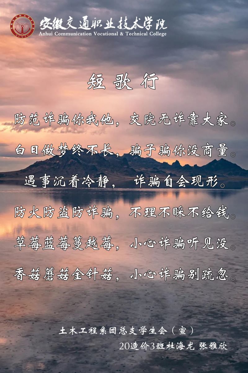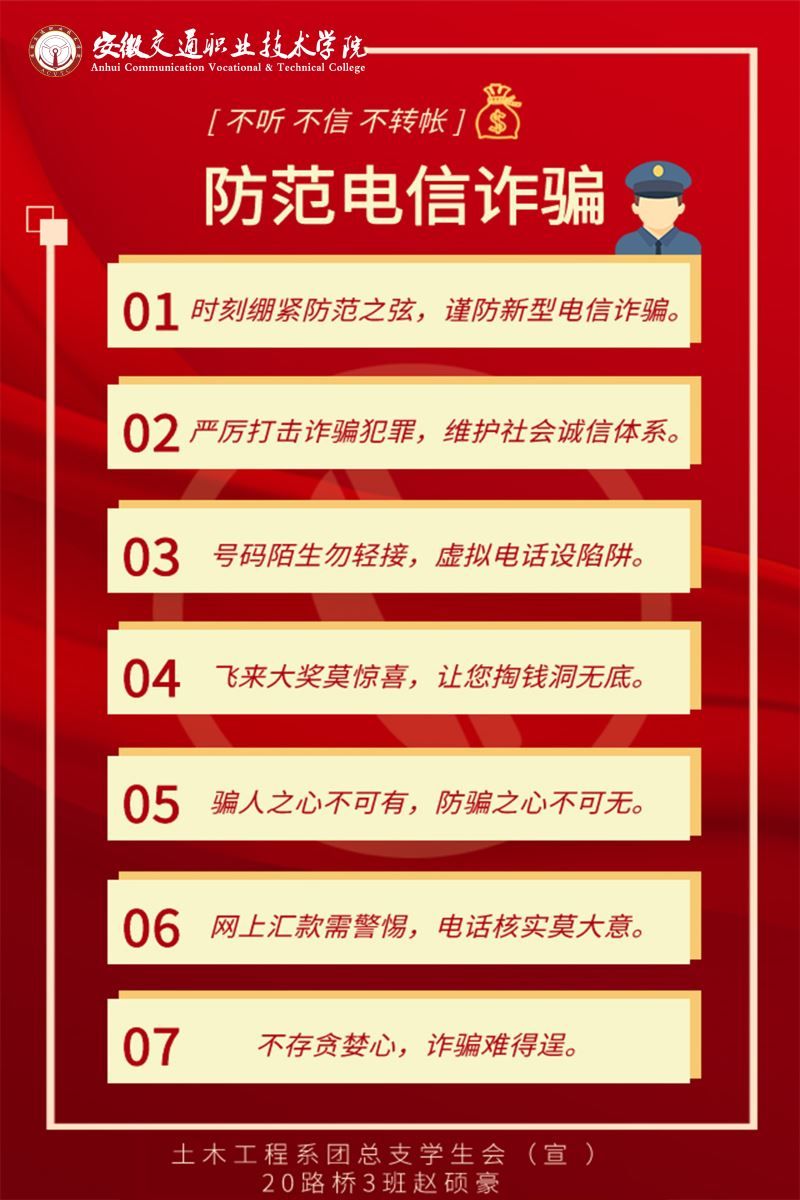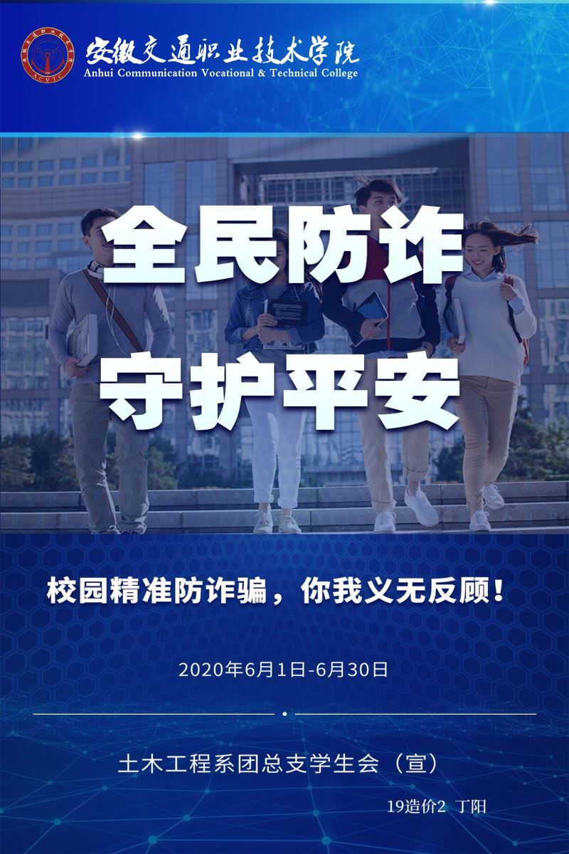 網(wǎng)絡(luò)防詐騙作品征集活動:5月18日晚自習,土木工程系學生會生活部組織開展了防詐騙宣傳作品征集活動,作品內(nèi)容為:防詐騙主題的標語、宣傳海報、短視頻等。
