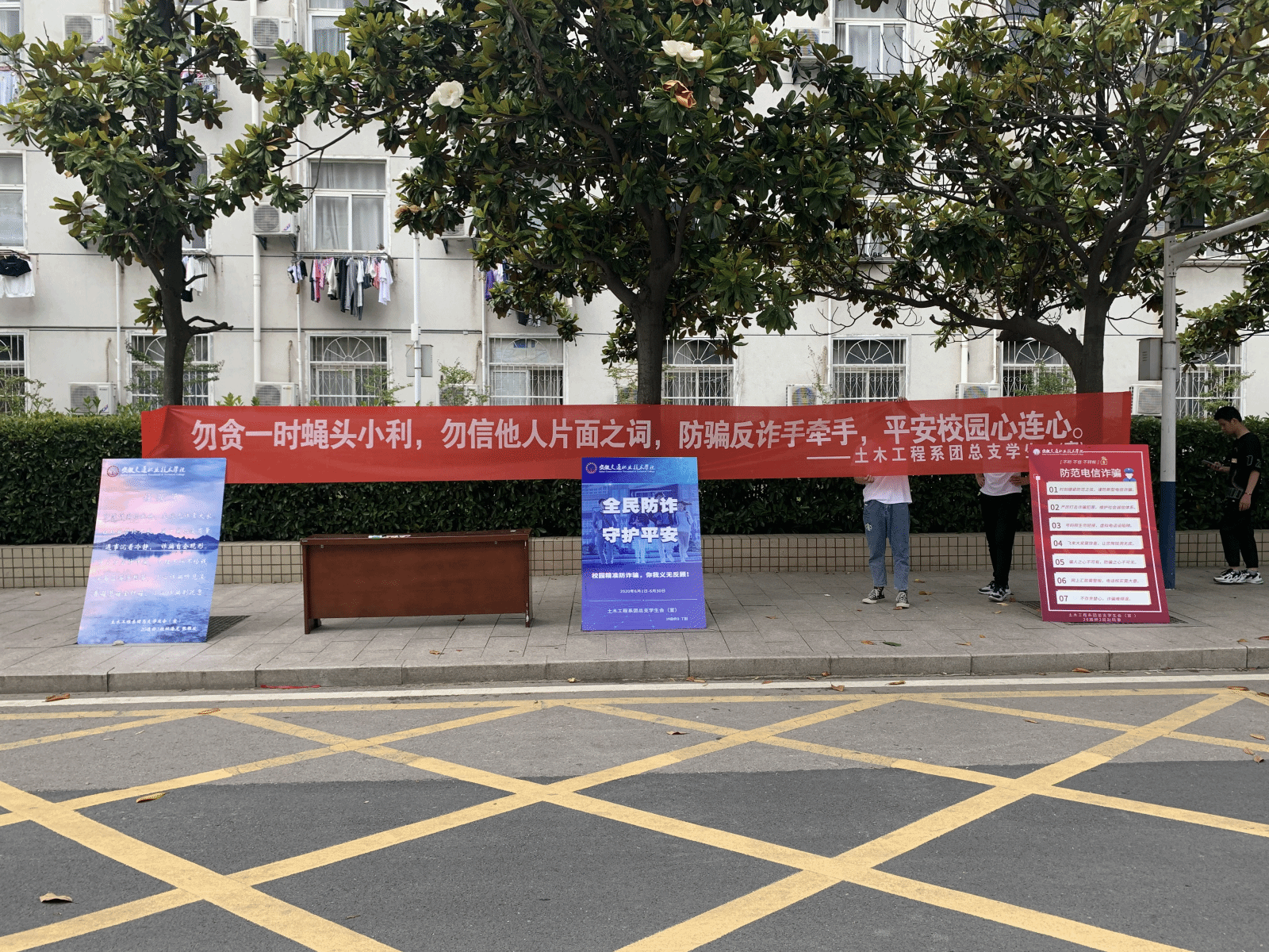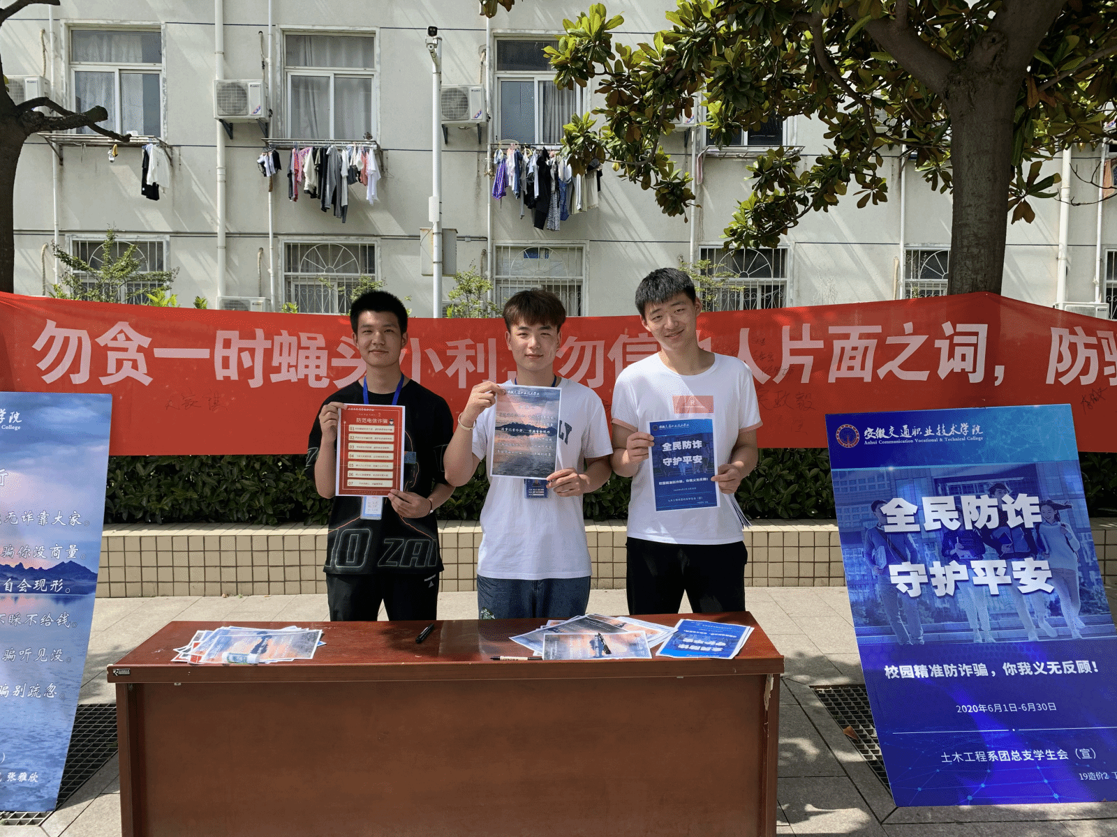 網(wǎng)絡(luò)防詐騙宣傳活動:5月25日,土木系生活部的干事們將征集到的優(yōu)秀作品打印出來展示在教學樓前,并將防詐騙宣傳海報張貼在各宿舍樓下,對過往的同學們進行防詐騙知識宣傳。