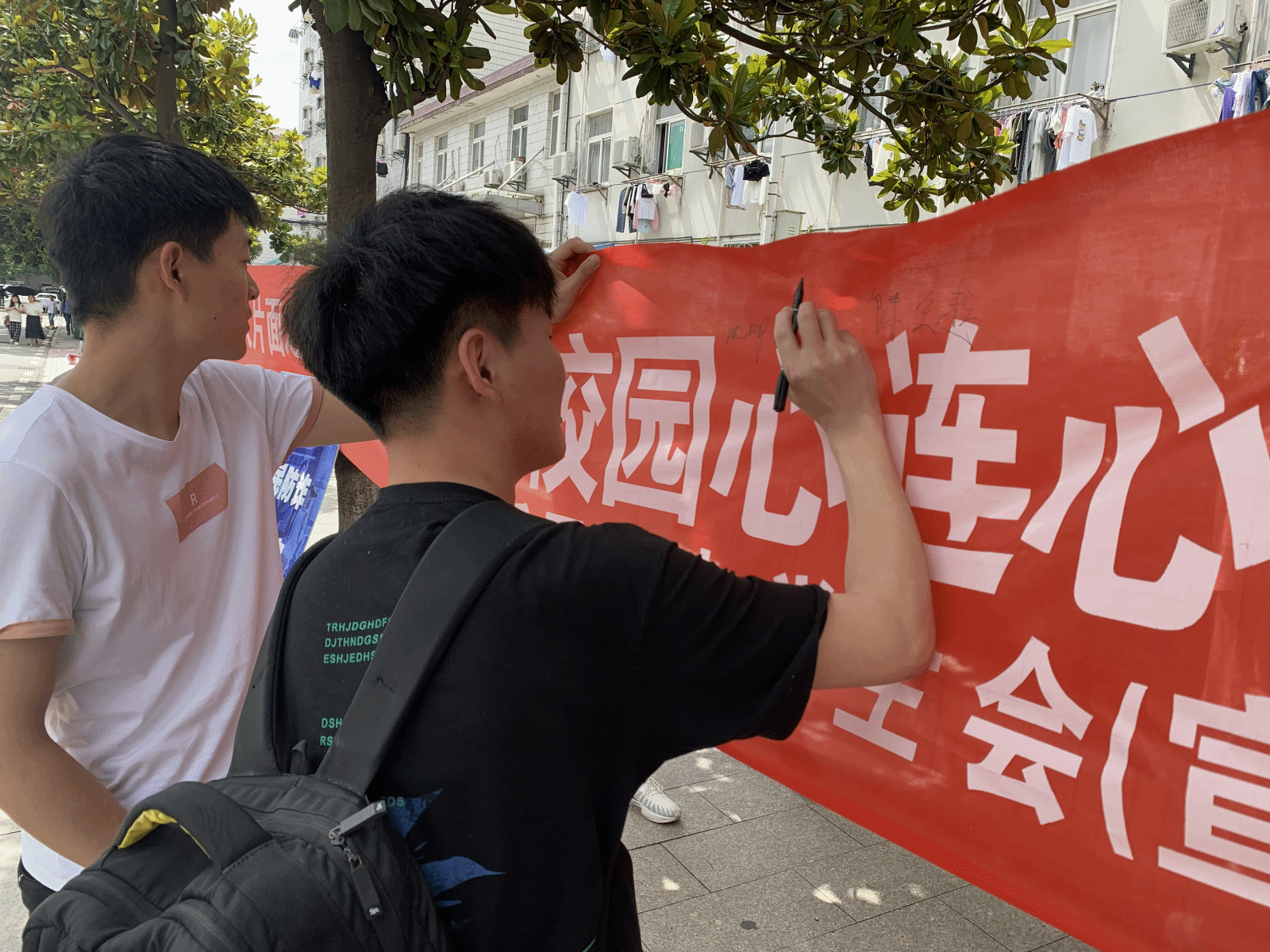 網(wǎng)絡(luò)防詐騙簽名活動:5月27日,土木系生活部將征集到的防詐騙標語打印出來,制作成橫幅,再次對過往學生進行防詐騙知識宣傳,并進行了防詐騙簽名活動,同學們紛紛在橫幅上留下自己的簽名,也將防詐騙意識刻在了心里。